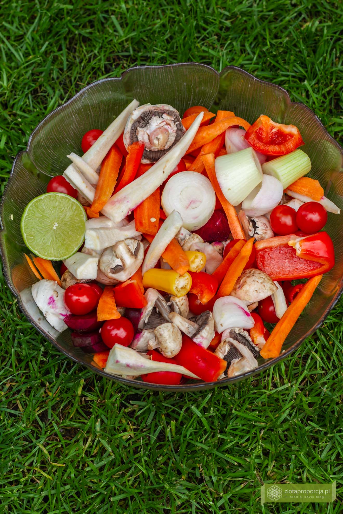 Warzywa myjemy, obieramy i kroimy. Marchewkę i pietruszkę kroimy w słupki, cukinię w talarki, paprykę i cebulę w większe kawałki. Małe pieczarki dodajemy w całości, większe kroimy na pół lub w ćwiartki. Podobnie robimy z czosnkiem – mniejsze ząbki dodajemy w całości, a większe kroimy na pół. Ostrą paprykę dodajemy według uznania, im więcej jej damy, tym bardziej pikantne będą wszystkie warzywa. Zazwyczaj dodajemy jedną lub dwie. Kroimy ją na 1-2 cm kawałki. Pokrojone warzywa mieszamy w misce, zalewamy świeżo wyciśniętym sokiem z jednej limonki i i dwoma łyżeczkami oliwy, a następnie odstawiamy na 20-30 minut, aby warzywka i sok z limonki miały czas się „przegryźć”.