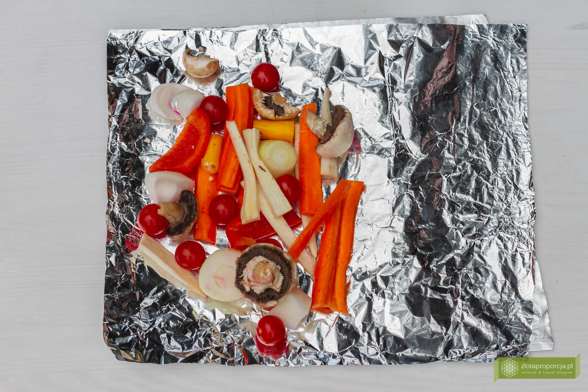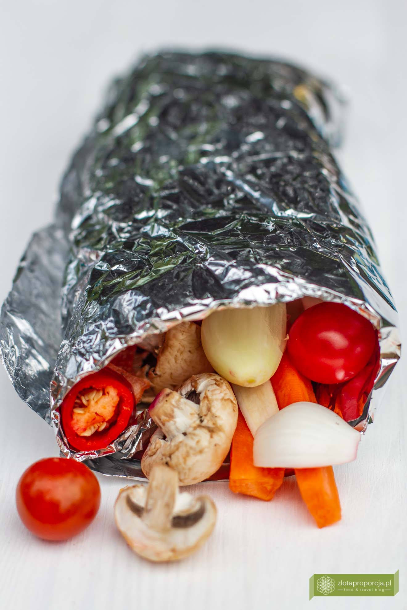Warzywa grillujemy w rękawach z folii aluminiowej. Składamy na pół folię aluminiową (chcemy otrzymać kawałek wielkości kartki A4) i zawijamy ją wzdłuż dłuższego boku zostawiając miejsce na warzywa. Jeżeli będzie Wam wygodniej możecie zawijać ją na butelce po małej wodzie. Następnie zaginamy dwukrotnie jeden koniec rulonu i przez drugi koniec napełniamy rękaw warzywami. Kiedy jest już pełny zamykamy go, kładziemy na rozgrzane węgle na grillu i zawijamy kolejny rękaw. Z podanej porcji wyjdą 2-3 rękawy. Warzywa grillujemy na żarze 15 minut z jednej i 15 minut z drugiej strony.