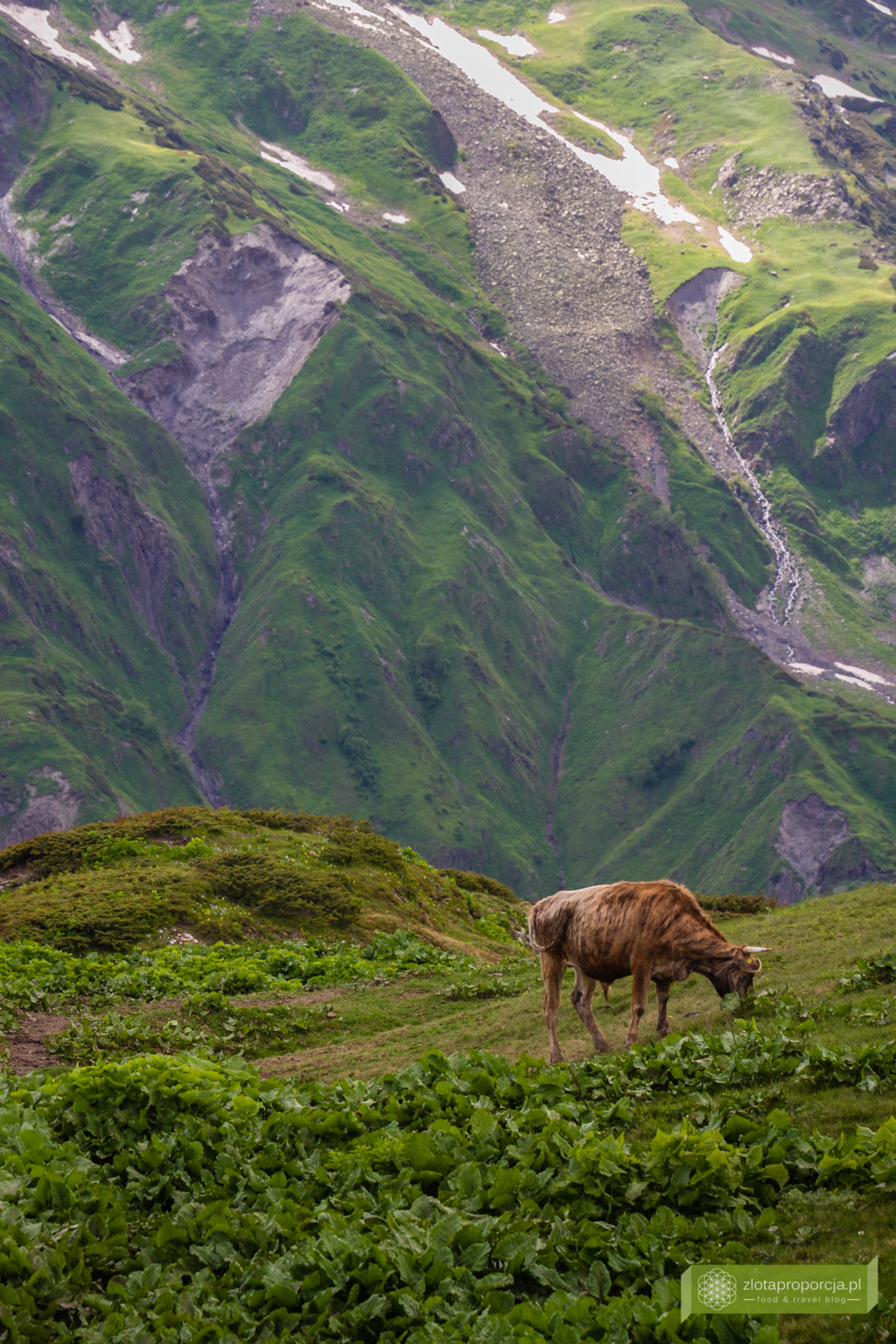 Im bardziej się do Swanetii zbliżaliśmy, tym bardziej widoki zapierały nam dech w piersiach. A przecież to, co najlepsze było dopiero przed nami na górskich szlakach. Zaczęliśmy od lodowca Chalaadi. Pierwsza część drogi strasznie się dłużyła, nie tak wyobrażaliśmy sobie trekking w Swanetii – płaska droga i ładne, ale monotonne krajobrazy. Nagle na horyzoncie pojawił się patrol policyjny w samochodzie terenowym. Co szkodzi nam zapytać czy nie przewiozą nas przez ten nudny kawałek? Po chwili załadowaliśmy się we czwórkę na dwuosobową, tylną kanapę. No to jedziemy! I to była świetna decyzja, szkoda sił i czasu na ten kilkukilometrowy odcinek. Wysiedliśmy przy podejściu na lodowiec i wszystkim też radzimy tam podjechać.