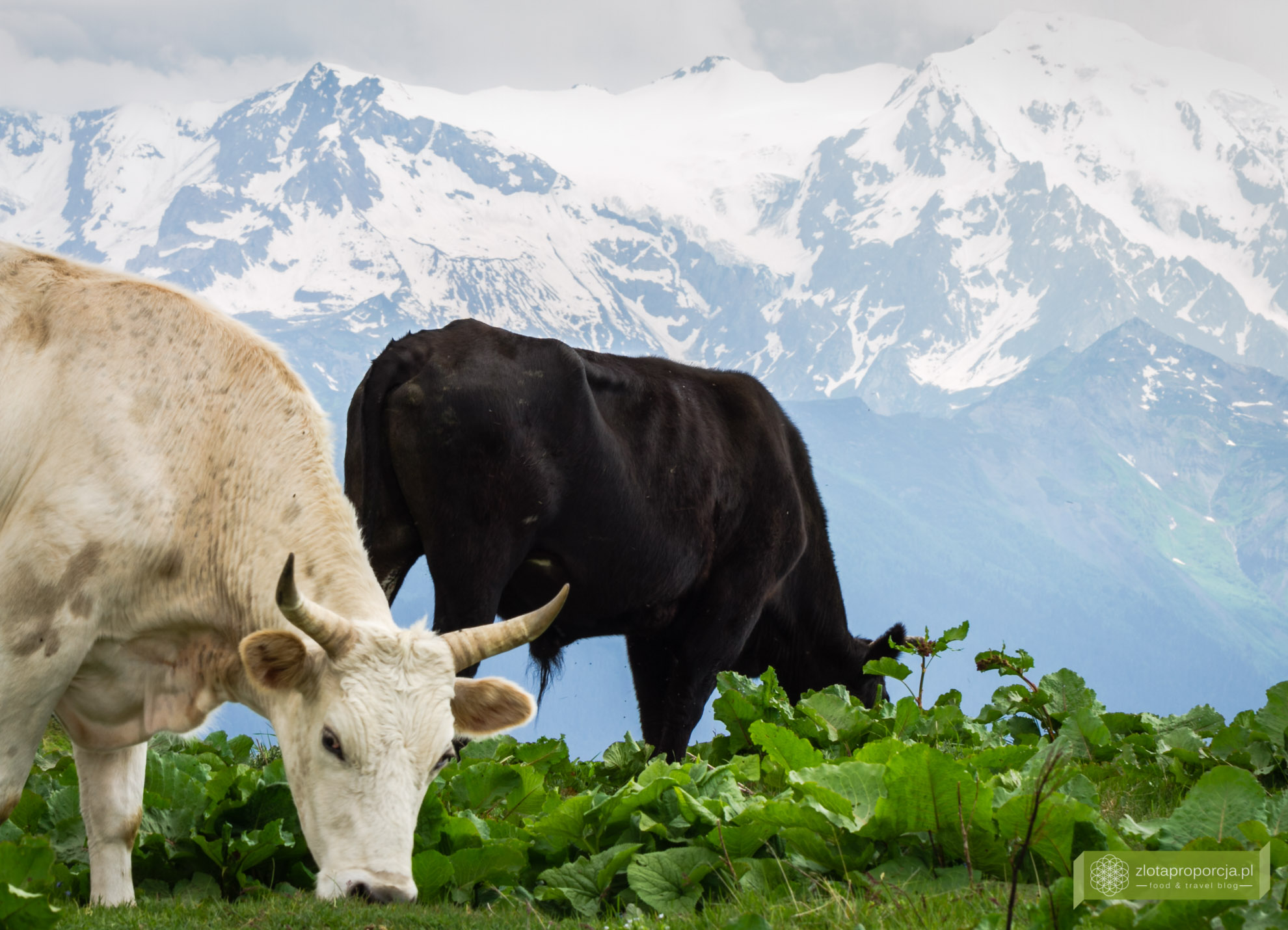 Spacerek to już nie jest, ale widoki pod drodze sprawiają, że zapominamy o zmęczeniu. Po zdobyciu wzgórza z krzyżem naszym oczom ukazuje się piękno Wysokiego Kaukazu. Jesteśmy na 2 500 metrów, a wokół nas po horyzont rozciągają się cztero- i pięciotysięczniki. Zielone zbocza i śnieżne wierzchołki.