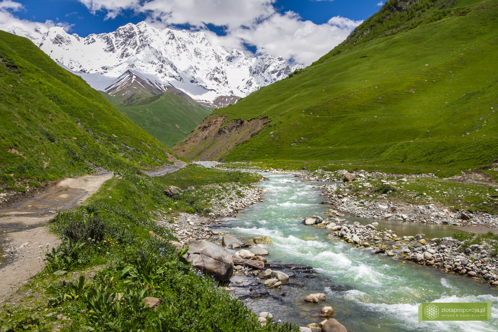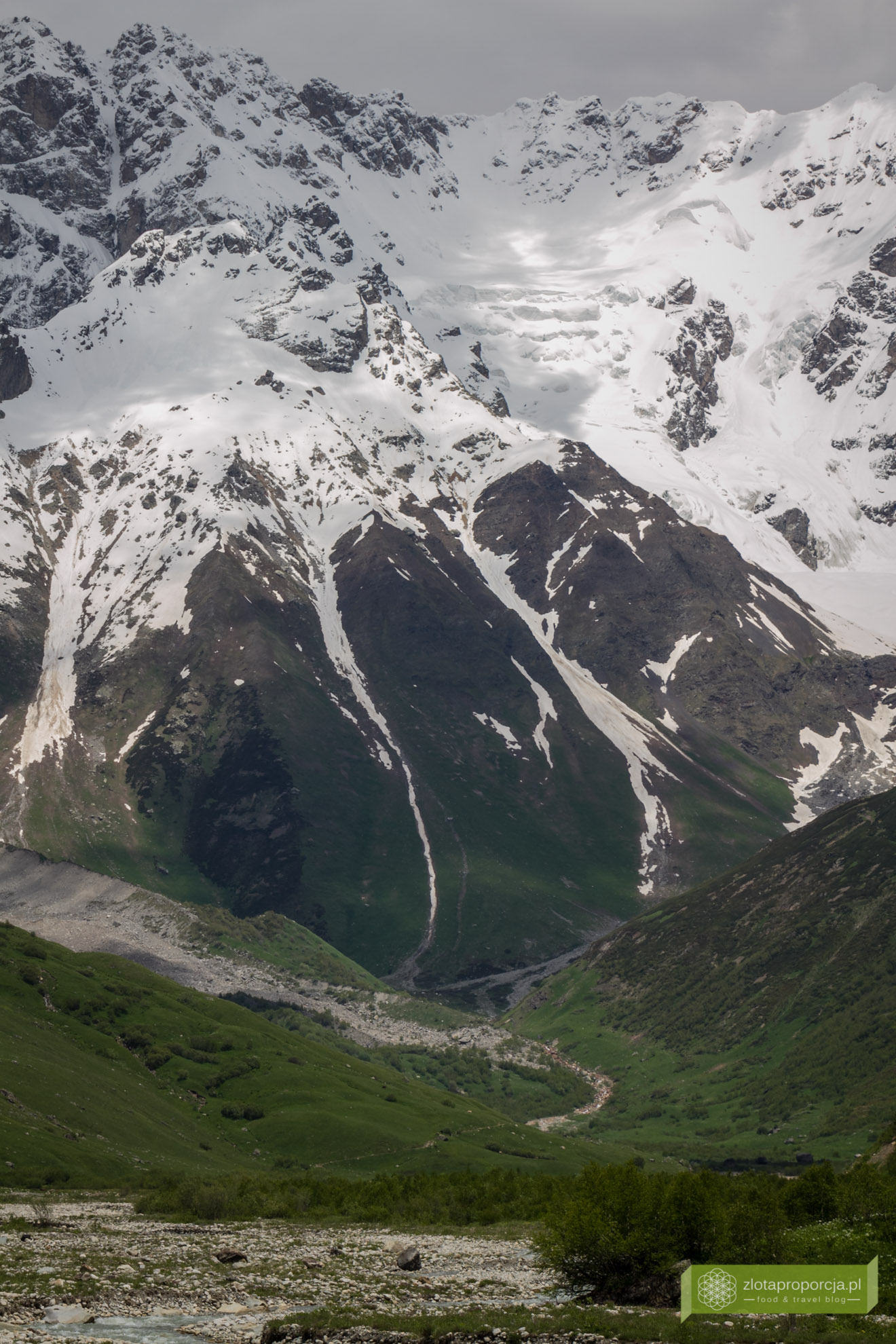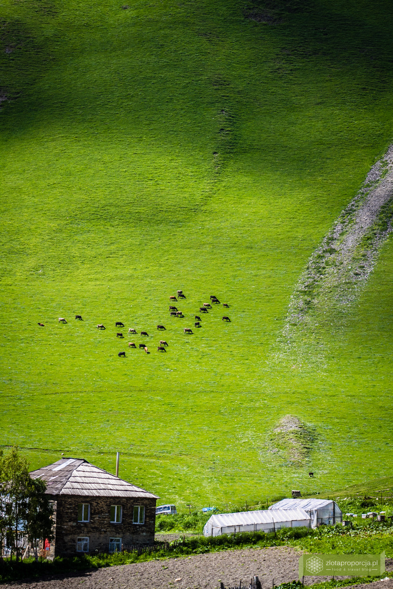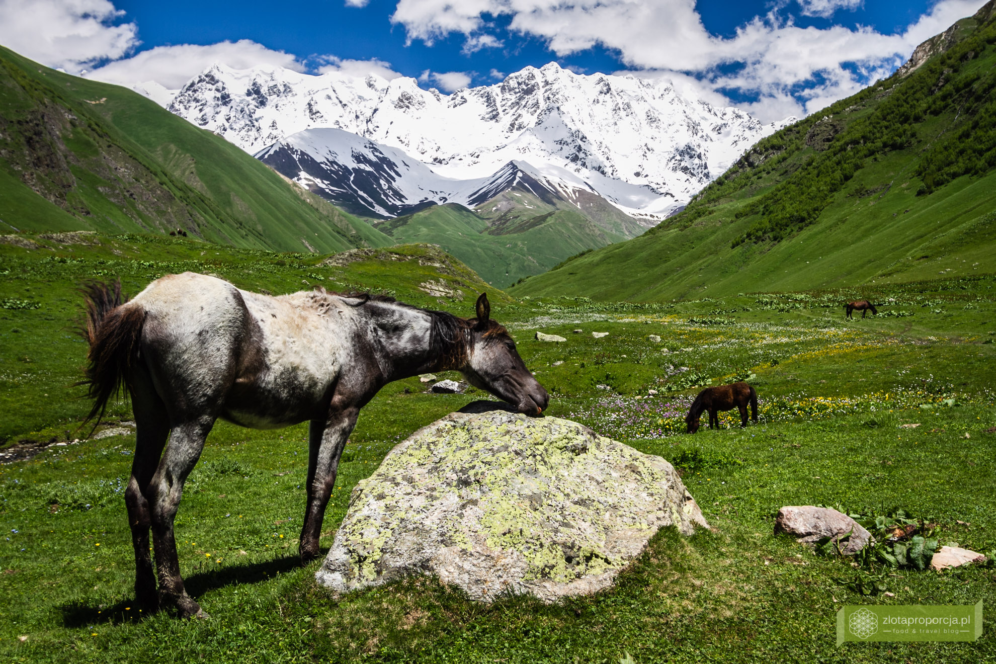 Bajeczna sielanka. Cisza, spokój, konie i krowy pasące się na łąkach. Większość turystów wpada tu na chwilę, robi kilka zdjęć, nie wychodzi poza wioskę i wraca do Mestii. My zatrzymaliśmy się na kilka godzin i bardzo, ale to bardzo żałujemy, że nie spędziliśmy w Uszguli kilku dni. Ale to jeszcze przed nami. Ruszyliśmy na lekki trekking w stronę lodowca Szchary. Nie mieliśmy szans na dotarcie do samego lodowca, doszliśmy mniej więcej do połowy drogi, ale tutaj każde kilkadziesiąt metrów dalej gwarantuje nowe, bajkowe widoki. To były najpiękniejsze widoki tego dnia. Jeżeli spędzilibyśmy ten czas tylko w Uszguli, zapewne nie wrócilibyśmy tak oczarowani, bowiem to nie sama wioska, ale krajobrazy znajdujące się w zasięgu Uszguli są największą atrakcją tego miejsca.