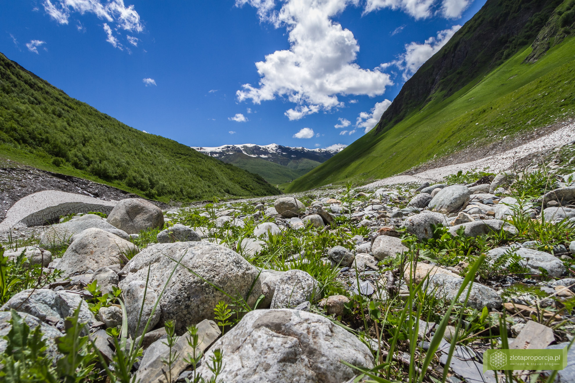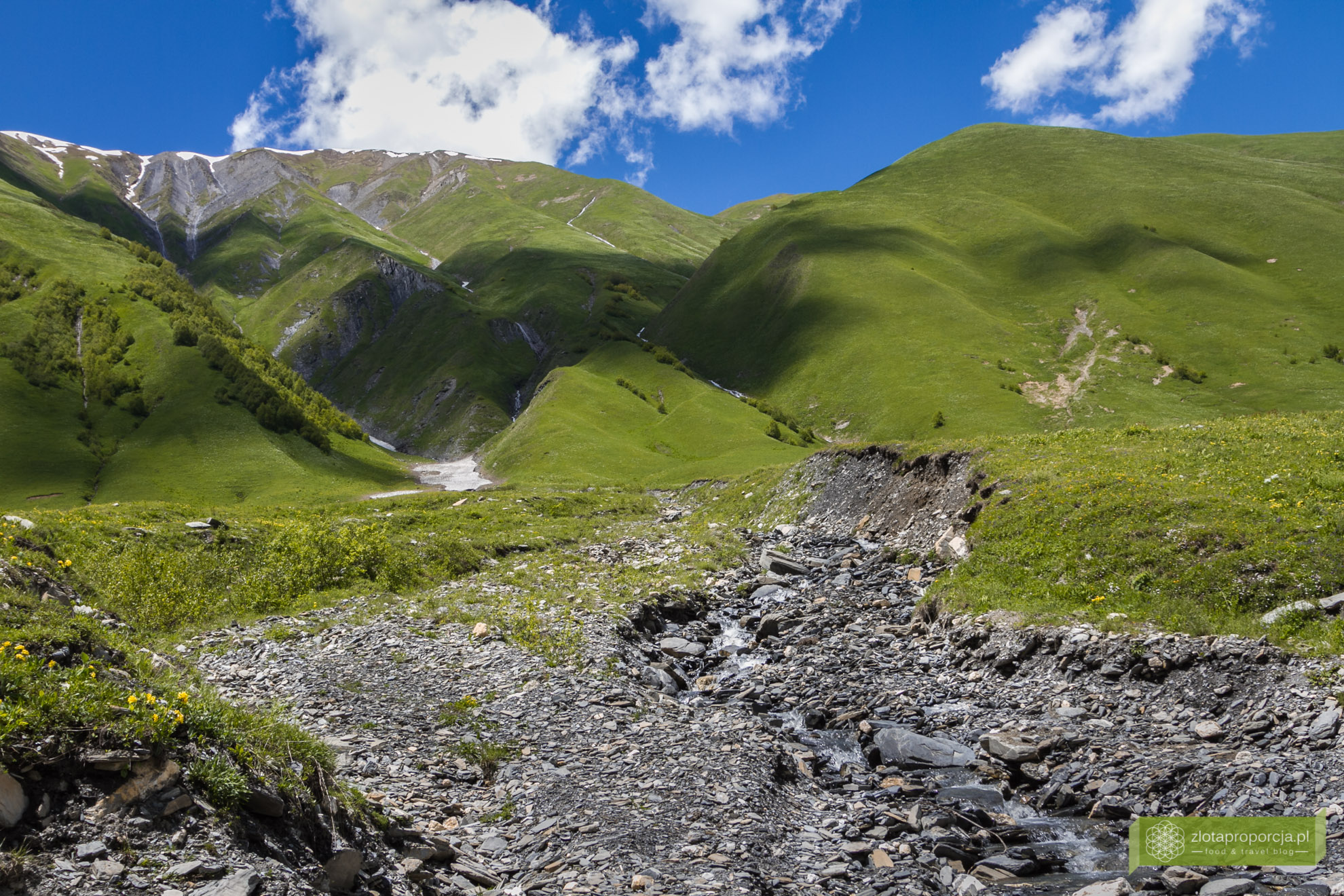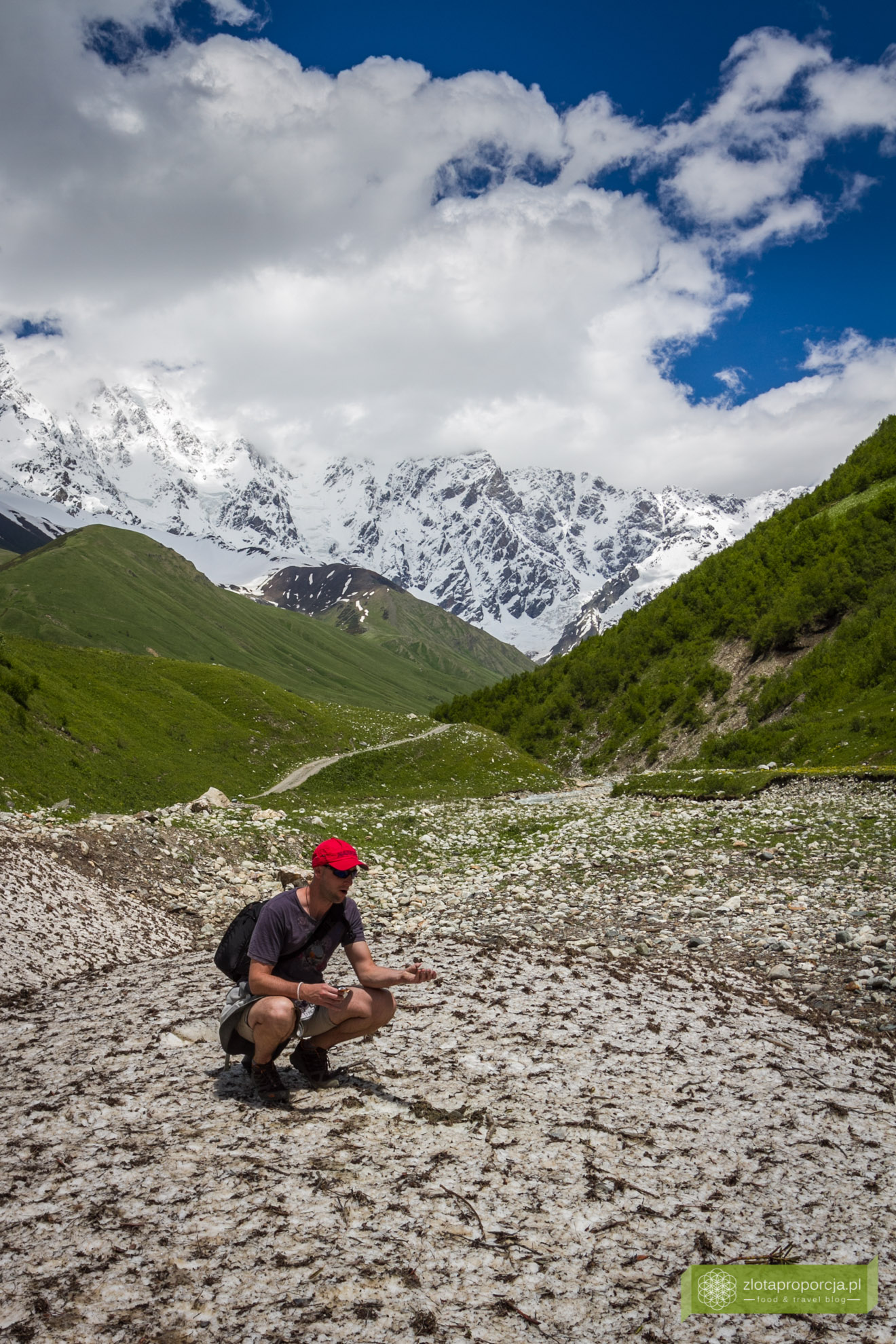 Co to jest? Kamienie? Styropian? A może śnieg? Zastanawialiśmy się patrząc z daleka. Szare plamy na naszej drodze okazały się zbitym śniegiem, po którym chodziło się jak po twardej gąbce. Wokół ponad było 20 stopni i palące słońce. Zimą wszystko wygląda tutaj inaczej. Dolinki wokół Uszguli zasypane są śniegiem, a droga do wioski jest nieprzejezdna.