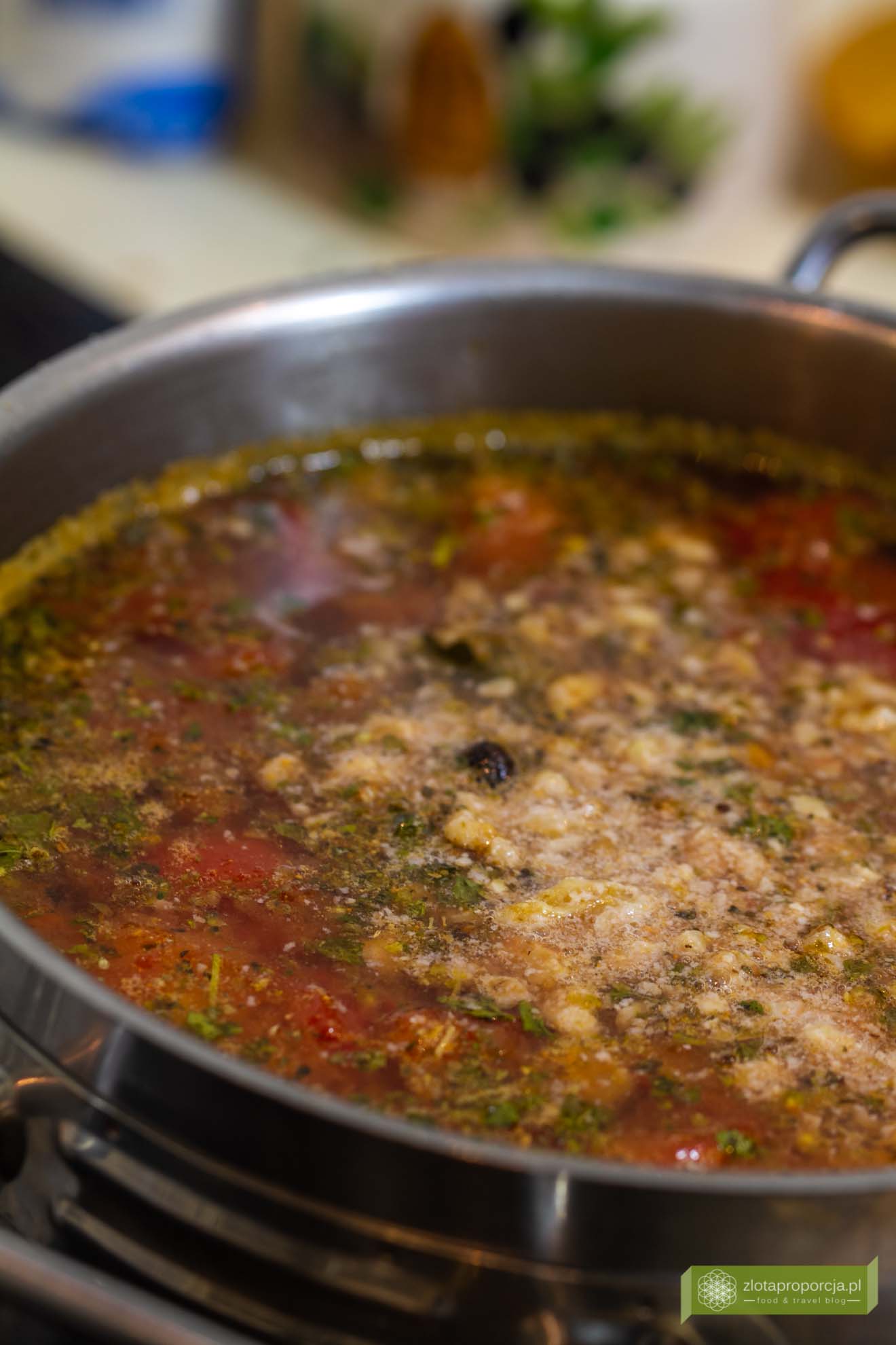 Pomidory myjemy i zalewamy na gorącą wodą. Przed zalaniem możesz delikatnie naciąć ich skórkę, aby łatwiej odchodziła. Po kilku minutach odlewamy pomidory z wody, obieramy ze skórki i kroimy na kawałki. W garnku na rozgrzanej oliwie szklimy przez kilka minut cebulę, a następnie dodajemy do niej pomidory. Doprawiamy je solą, pieprzem i rozgniecionymi ziarnami kolendry, dodajemy ziele angielskie i liść laurowy, po czym dusimy na małym ogniu przez kilka minut. Dodajemy wywar, mieszamy, gotujemy kilka minut i doprawiamy oregano, kozieradką, majerankiem, cząbrem i połową orzechów włoskich (wcześniej rozdrabniamy je w moździerzu). Mieszamy i przez kolejnych kilka minut dusimy. Następnie rozgniatamy w moździerzu ostrą paprykę i czosnek i dodajemy je do zupy. Znowu mieszamy zupę i przez chwilkę dusimy.