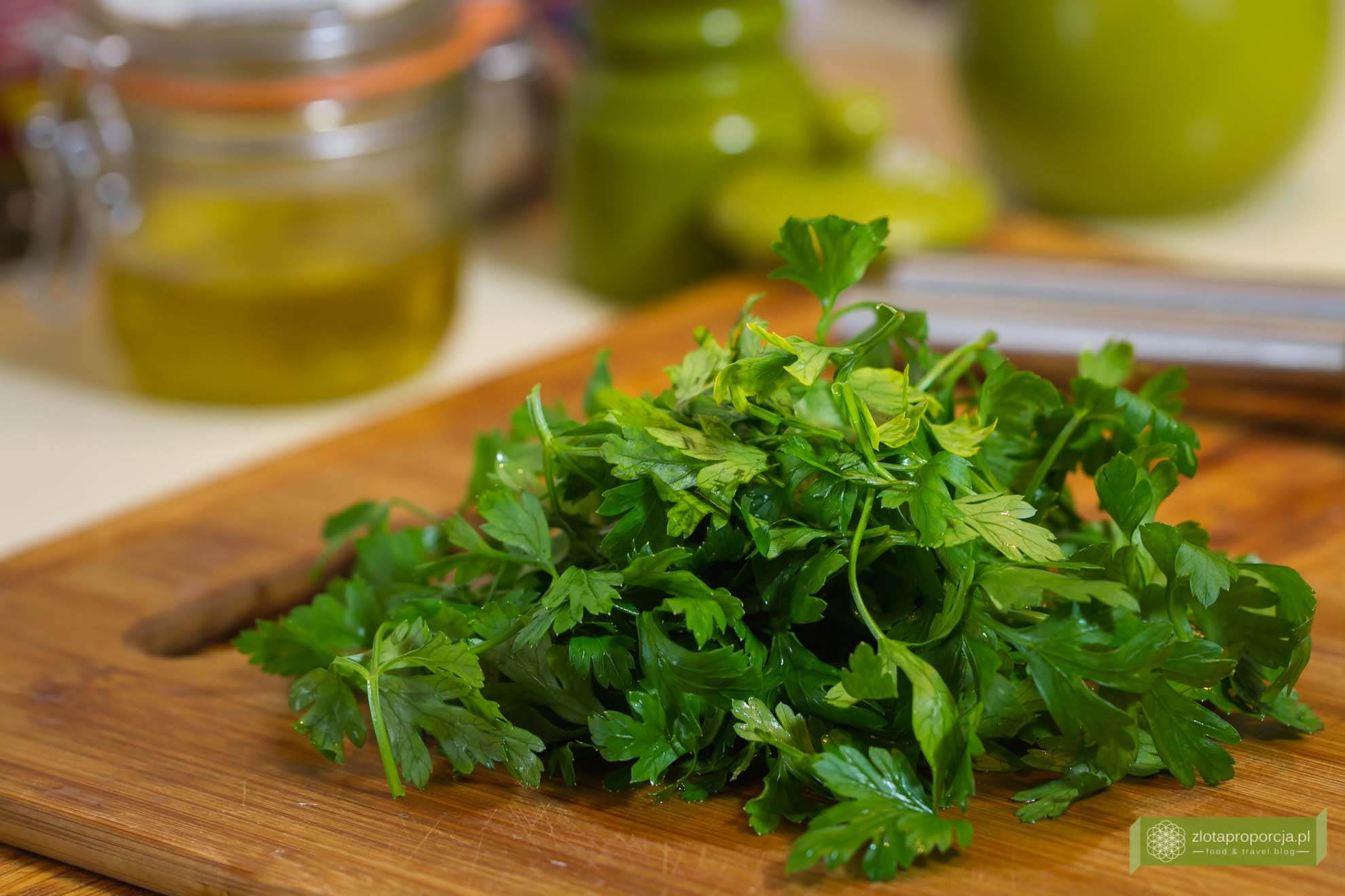 Wyjmujemy z garnka ziele angielskie i liść laurowy, po czym miksujemy zupę blenderem. Dodajemy do zupy pozostałą część orzechów i połowę świeżych ziół – bazylię, kolendrę i natkę pietruszki. Oczywiście wcześniej je siekamy. Jeżeli masz świeże oregano czy majeranek, nie zawahaj się ich użyć 🙂 Mieszamy zupę, jeżeli jest potrzeba doprawiamy jeszcze świeżym pieprzem. Przed podaniem posypujemy talerze świeżymi ziołami, które nam zostały.