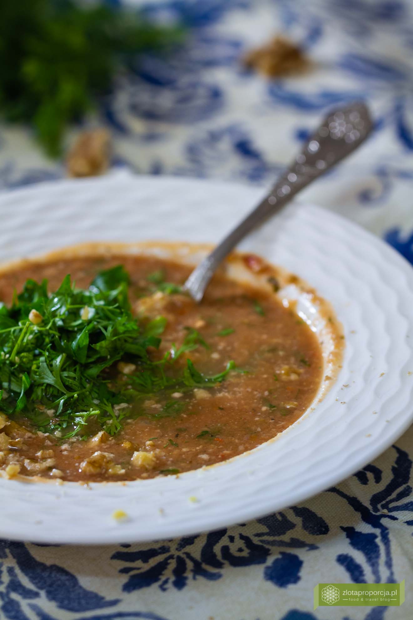 Gruzińska zupa pomidorowa z orzechami i świeżymi ziołami