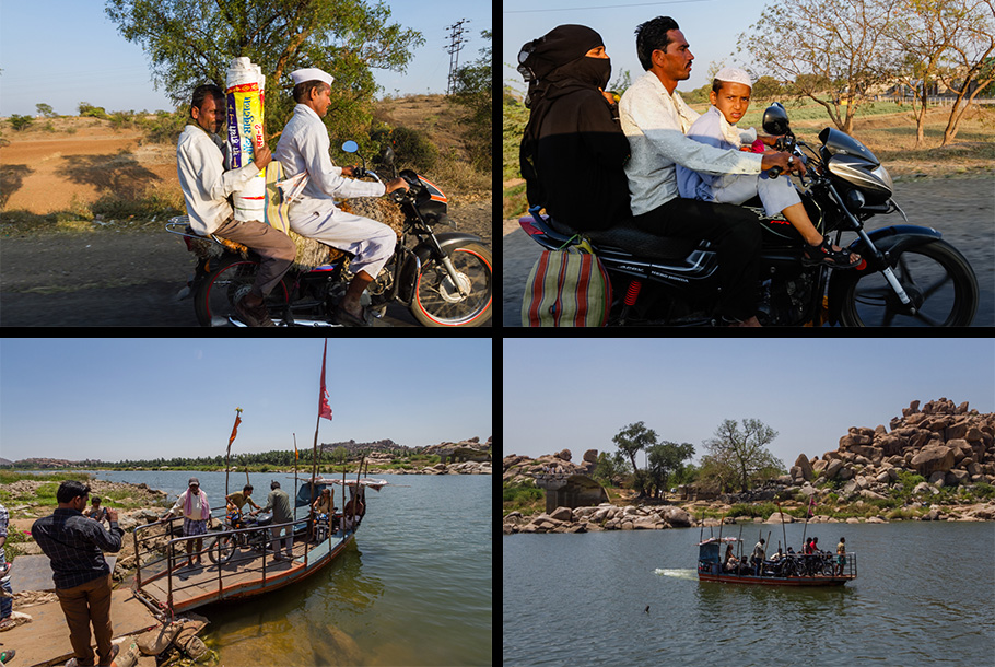 Jak przeprawić się z motorem na drugą stronę rzeki w Hampi? Najlepiej takim promem jak na zdjęciach powyżej. Wchodzi na niego tyle osób i motorków ile się zmieści. Most zaczęli budować, ale najwyraźniej się rozmyślili, bo wystaje tylko jedno, wiekowe przęsło.