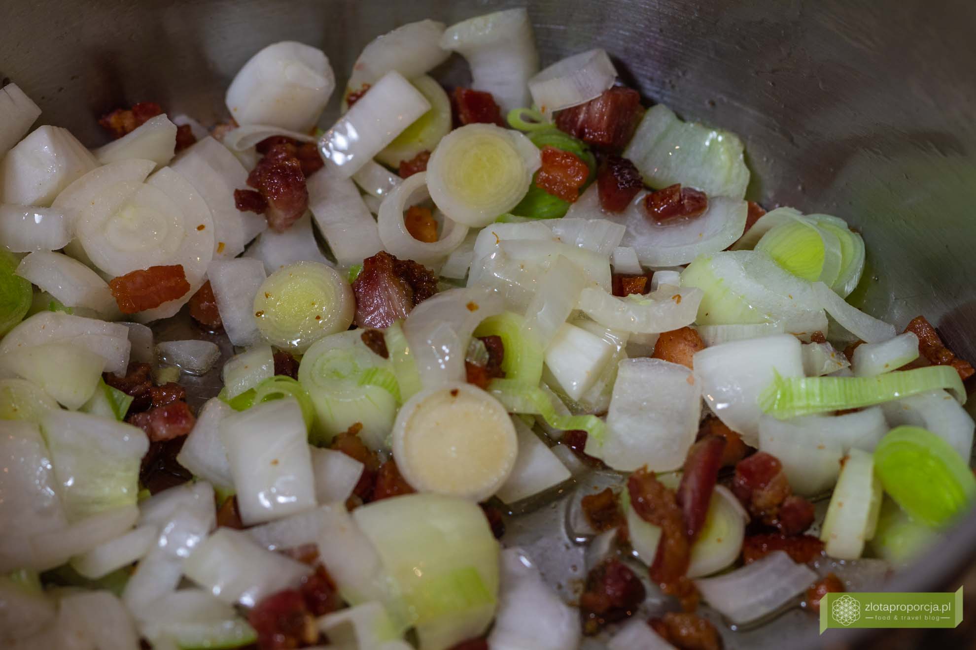 Zacznij od przygotowania 1 litra wywaru warzywnego na przykład z naszego przepisu: Jak przygotować prawdziwy wywar warzywny. Następnie odkrój skórę z boczku, pokrój go na kawałki, wrzuć do garnka, w którym będziesz robić zupę i podsmażaj go, dopóki nie wytopi się tłuszcz i boczek ładnie nie zbrązowieje. W międzyczasie pokrój cebulę, pora, marchewkę i seler. Kiedy boczek będzie gotowy odlej część tłuszczu i zeszklij na pozostałym tłuszczu cebulę. Po 2-3 minutach do cebuli dodaj pora, a kiedy cebula i por będą miękkie, dodaj marchewkę i seler, zamieszaj, chwilę podsmaż, dodaj całe ziemniaki (młode ziemniaki mogą być w mundurkach), zalej wywarem, dopraw solą i pieprzem i pozwól gotować się zupie na średnim ogniu dopóki ziemniaki nie zmiękną.