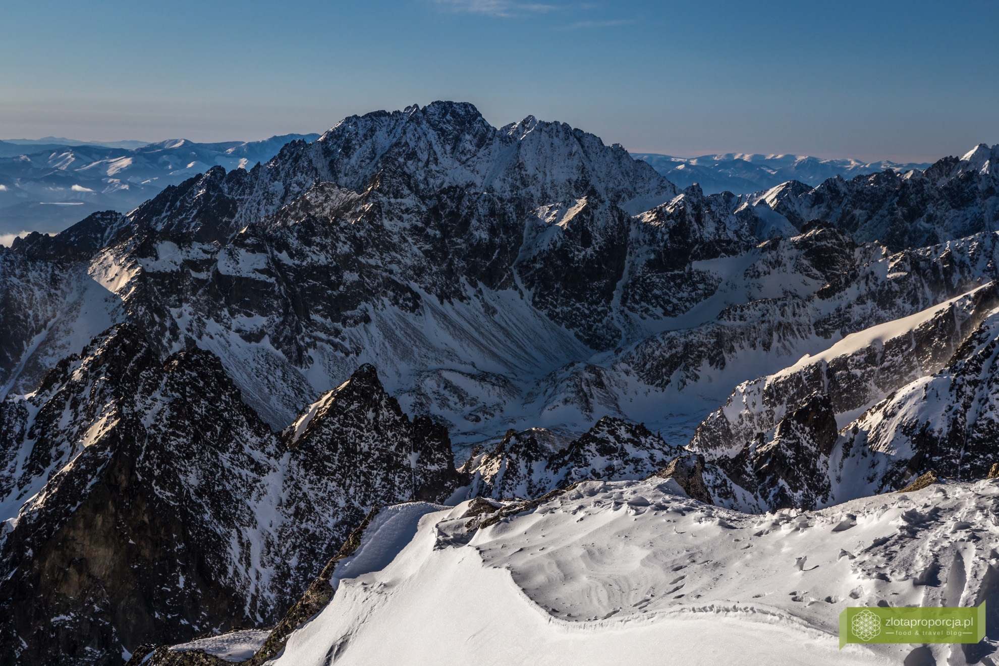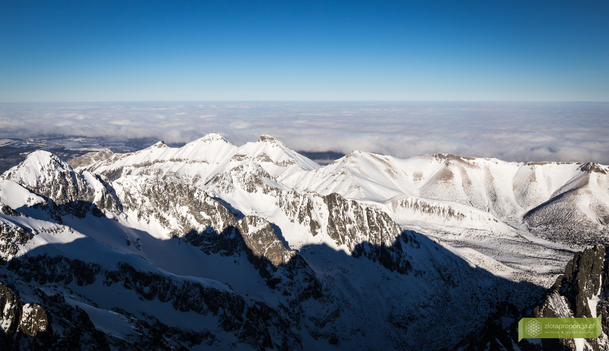 Wypięliśmy na chwilę deskę i narty. Wiadomo widoki smakują najlepiej jak poprzedza je wysiłek wędrówki, tym razem będzie jednak inaczej. Wjechaliśmy na górę 15-osobową kolejką linową, którą wjeżdża na szczyt od ponad 75 lat. Łomnica cały czas trzyma w dłoni jeszcze jeden tytuł najpiękniejszego tarasu widokowego w Wysokich Tatrach. Przy dobrej pogodzie widać z niego aż 300 szczytów i turni. O widoczność nie powinniśmy się martwić, jest -17 stopni i praktycznie ani jednej chmurki na niebie. Dokładnie jak rok temu, kiedy w Bieszczadach ze Smereka ujrzeliśmy całe Tatry. Chociaż wtedy było jeszcze zimniej.