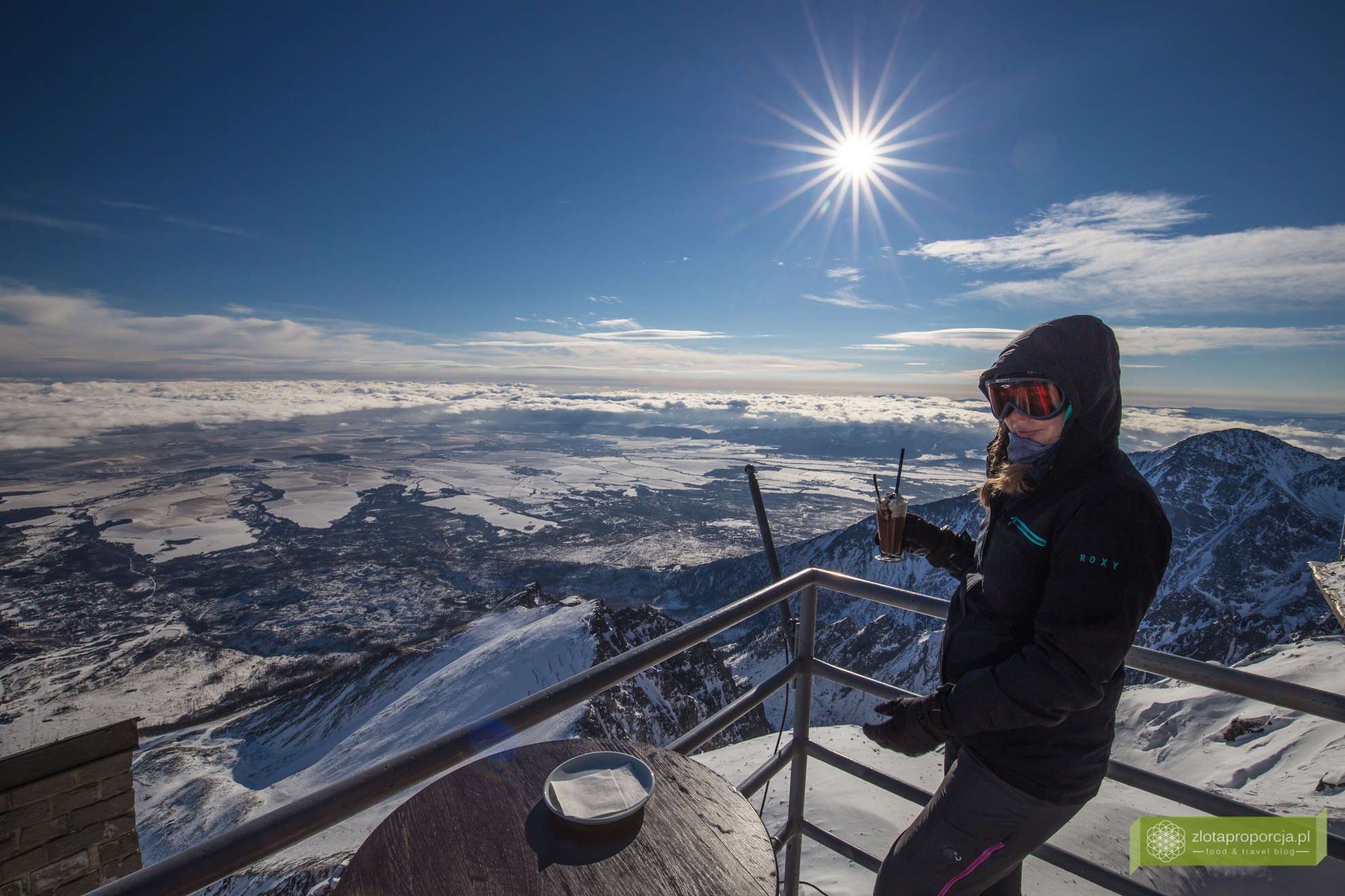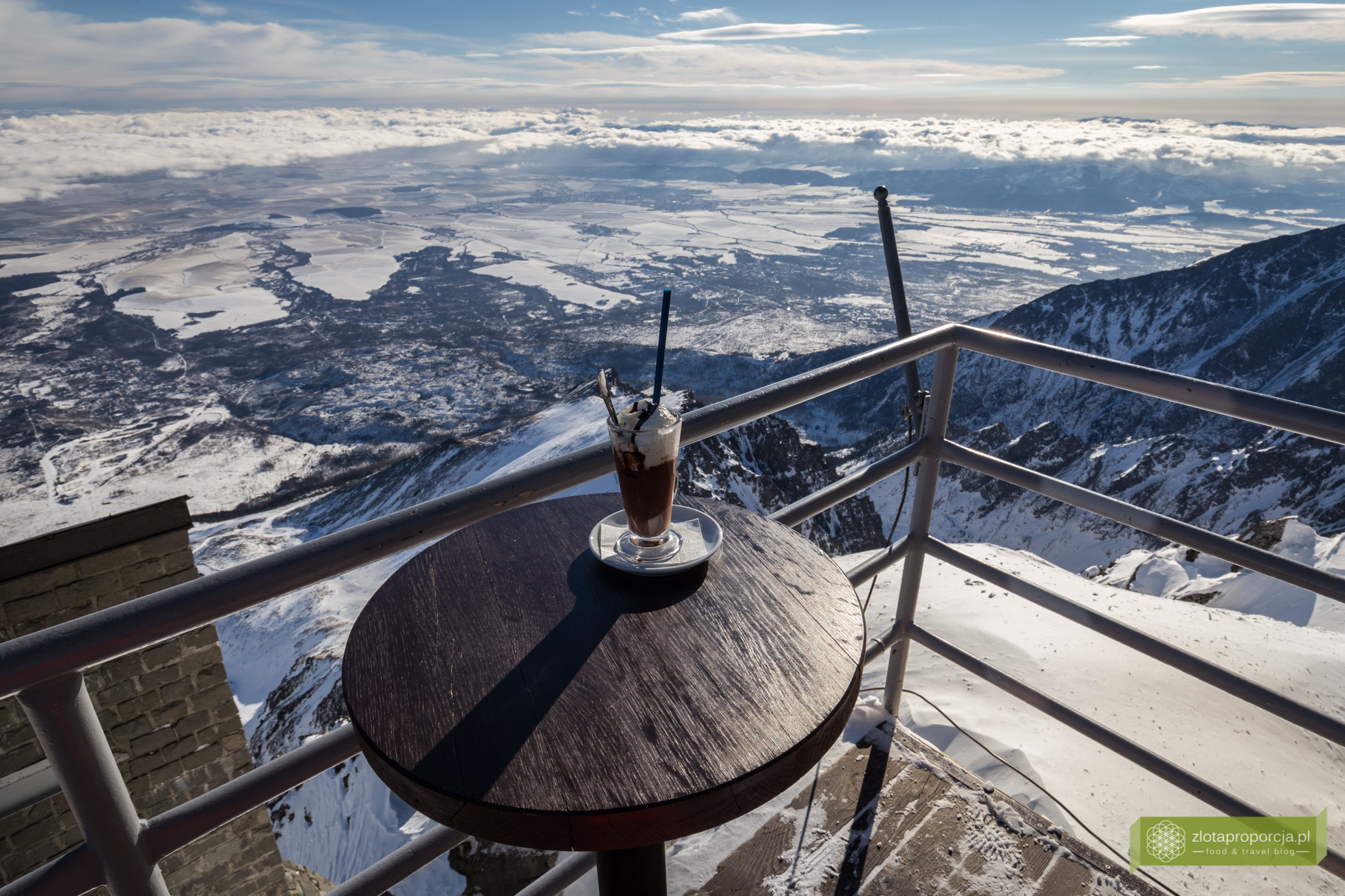 Czas na gorącą czekoladę z najpiękniejszym możliwym widokiem. Za 3,20 euro, całkiem przystępna cena jak na taką lokalizację. Sama czekolada okazuje się być wyśmienita. Gęsta i uczciwa. Na tarasie przed kawiarnią na szczęście nie wieje i znowu robi się przyjemnie. Czekolada szybko przestaje być gorąca. Z kawiarni wychodzi Słowak z piwem, który prosi Łukasza o zrobienie zdjęcia na tle gór. Kilka pstryknięć i wielkie zdziwienie Słowaka – pianka w piwie zamarzła. Chyba jednak nie jest tak ciepło jak nam się wydaje 🙂