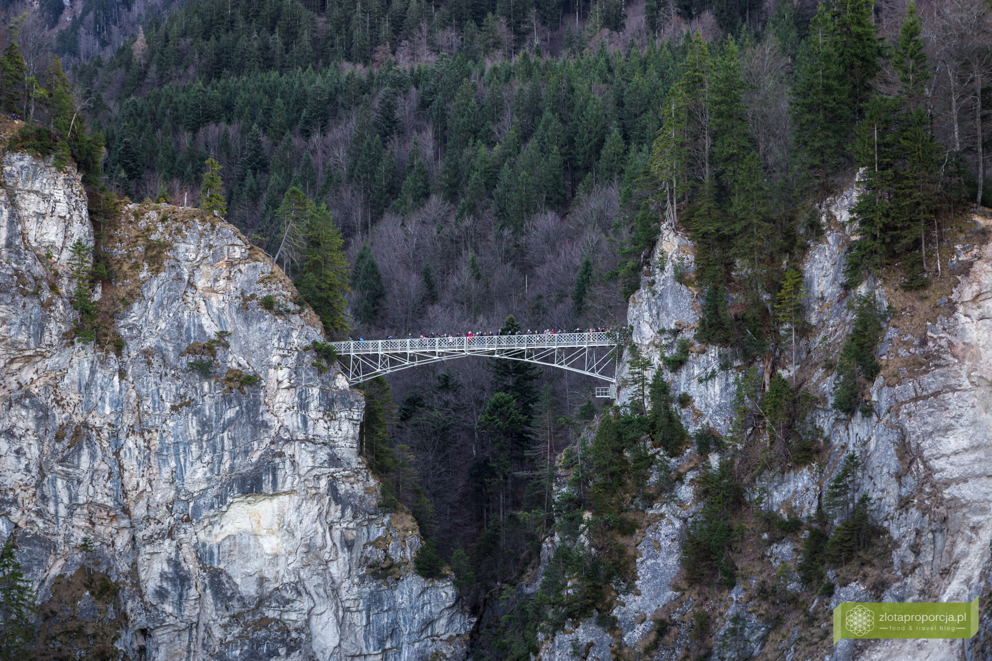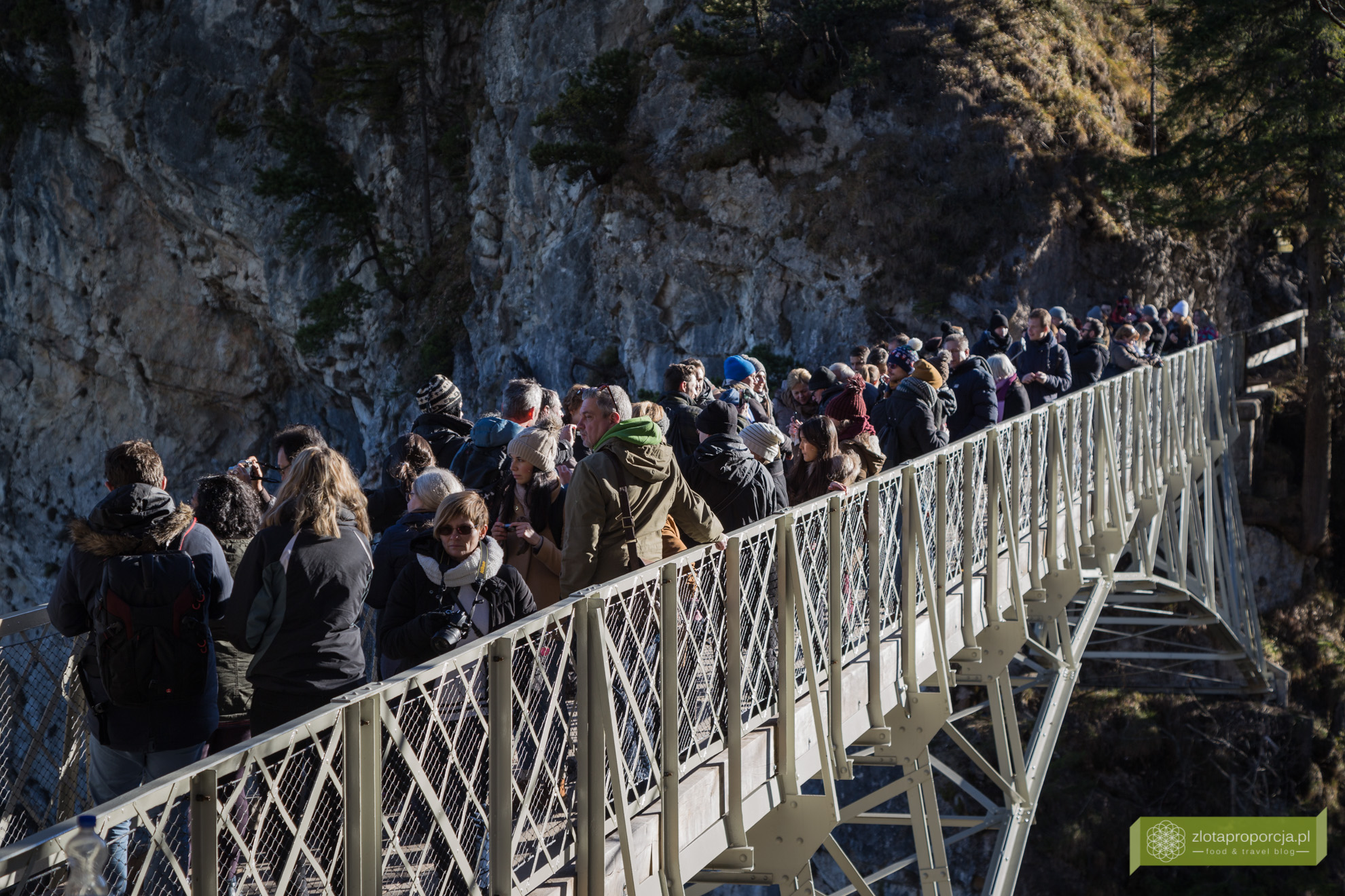 Ale zanim weszliśmy do zamku, trafiliśmy do drugiego słynnego miejsca w Schwangau – na most Marienbrücke. Zawieszony nad rzeką Pöllat na wysokości 984 m położony jest zaledwie kilkadziesiąt metrów od zamku. Jeżeli chcesz mieć własną pocztówkę z zamkiem, zrób zdjęcie właśnie tutaj – tak mówią chyba wszystkie przewodniki, a za przewodnikami podążają tłumy. Nie spodziewaj się więc, że będziesz na moście sam, jest to niewykonalne. Ale pomimo tych tłumów i tak możesz zrobić dobre zdjęcie. Marienbrücke znajduje się zaledwie kilkanaście minut spacerem od zamku, jeżeli jesteś w Schwangau, podejdź tam koniecznie.