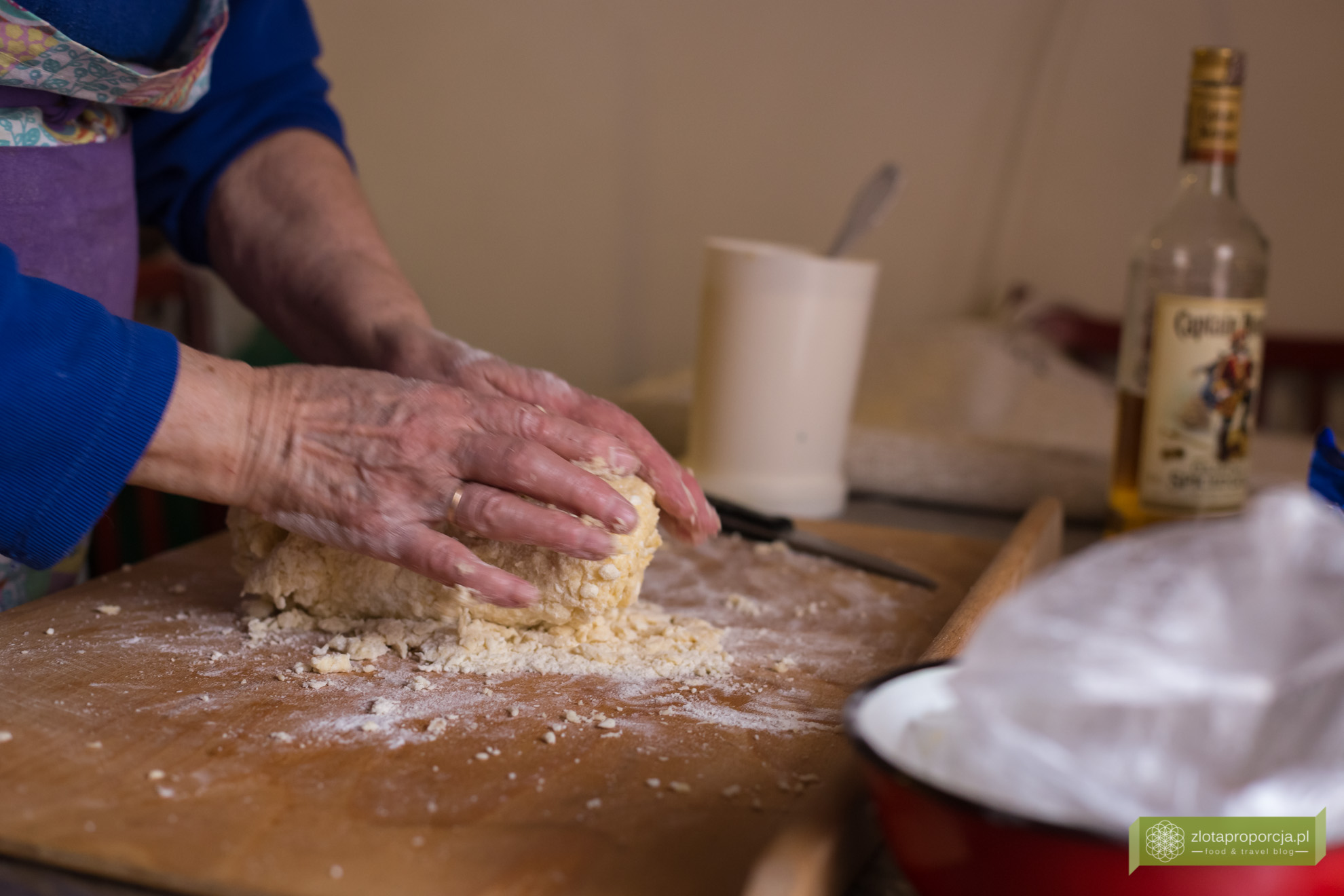 Zacznij od przesiania mąki. Następnie dodaj do mąki cukier, sodę, proszek do pieczenia i cukier waniliowy, dobrze wymieszaj i dodaj masło pokrojone w małe kostki. Wyrób dobrze ciasto i dodaj pokruszony ser, dobrze wymieszaj, dodaj jajka, dwie nakrętki rumu i wyrabiaj dopóki nie otrzymasz gładkiej masy. Jeżeli jest potrzeba podsyp ciasto mąką. Rumu nie dodaje się do smaku, ale po to, aby oponki podczas smażenia chłonęły mniej tłuszczu. To sposób mojej babci, w tym samym celu używa się także spirytusu i octu, ale babcia dodaje rum i tego się trzymamy.