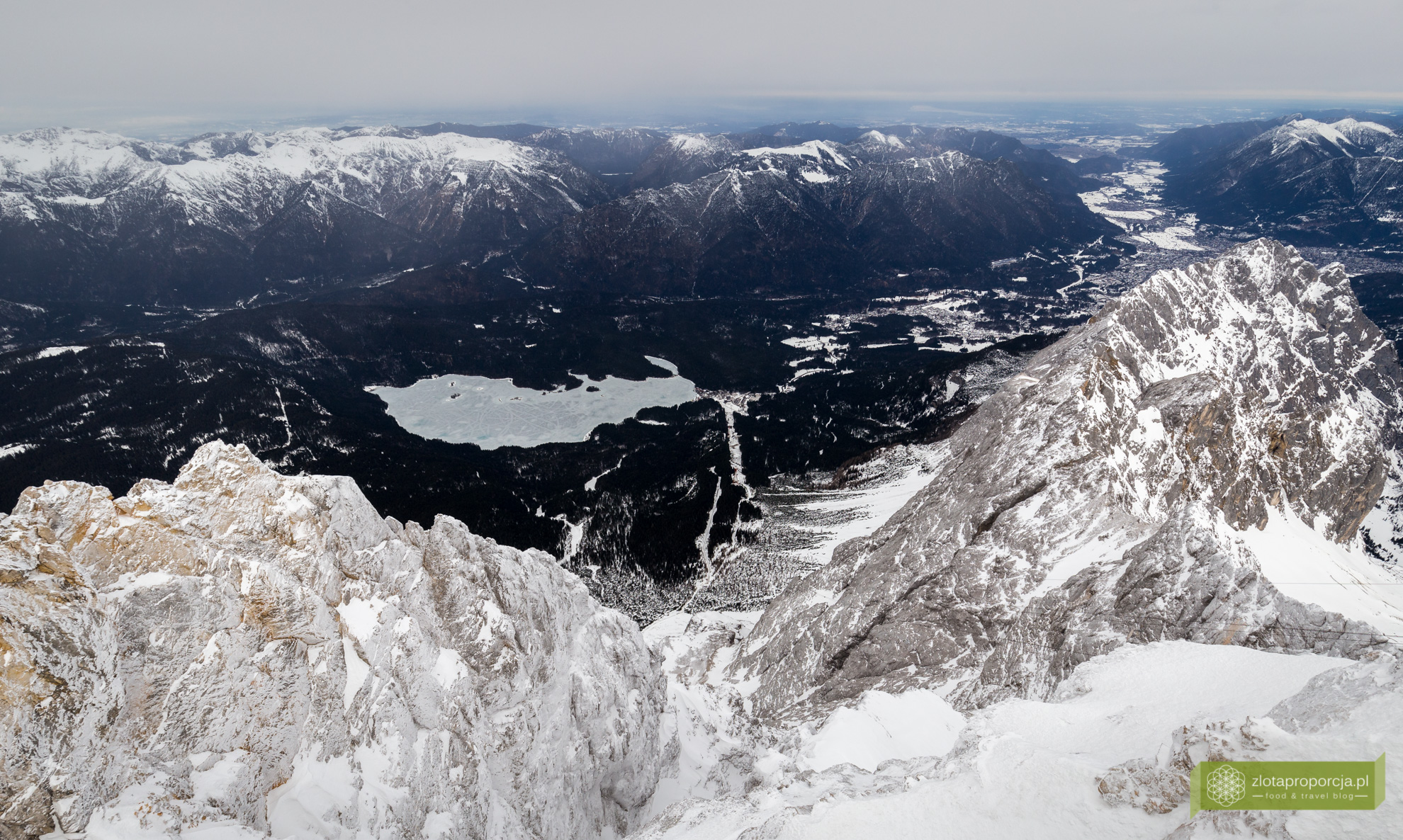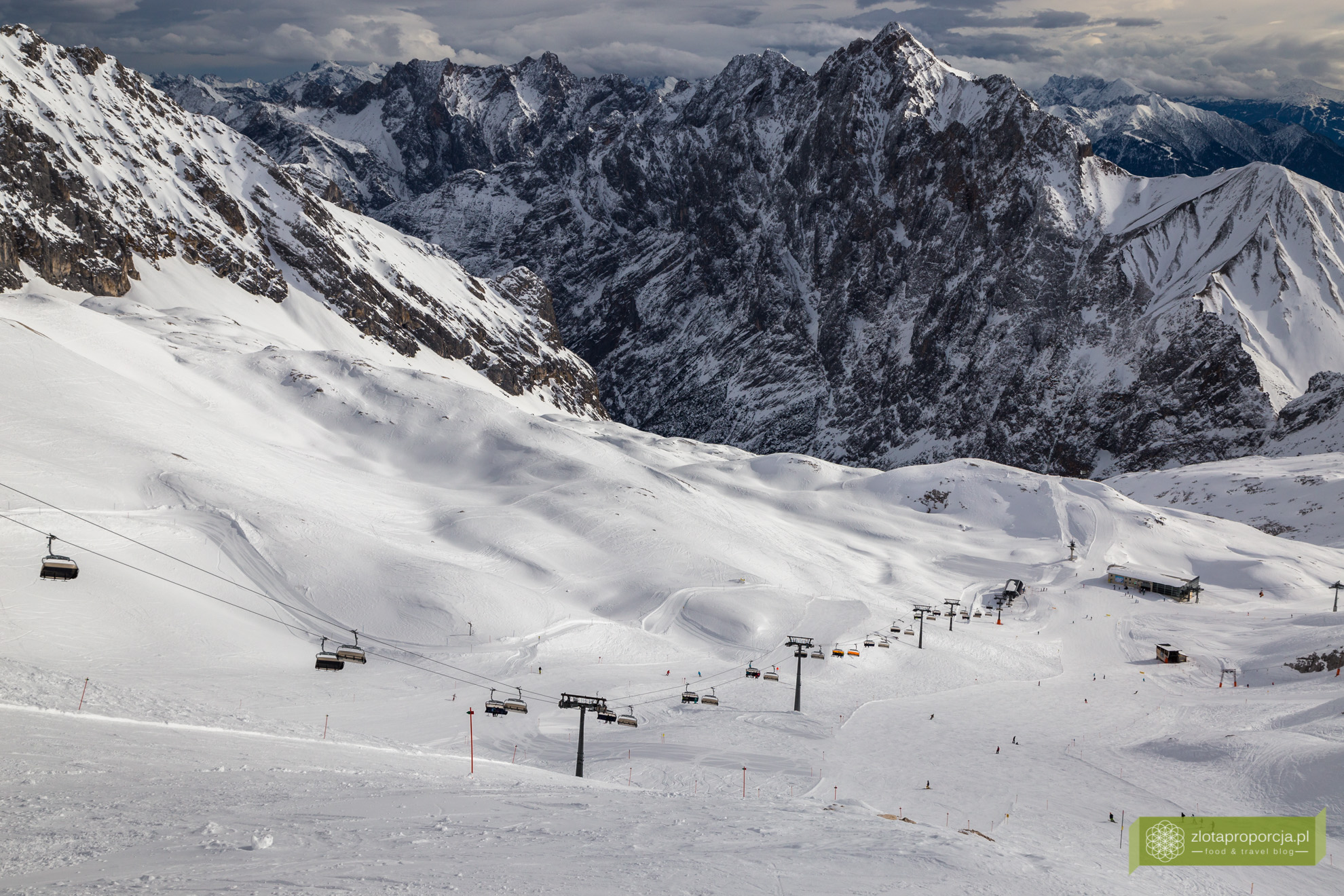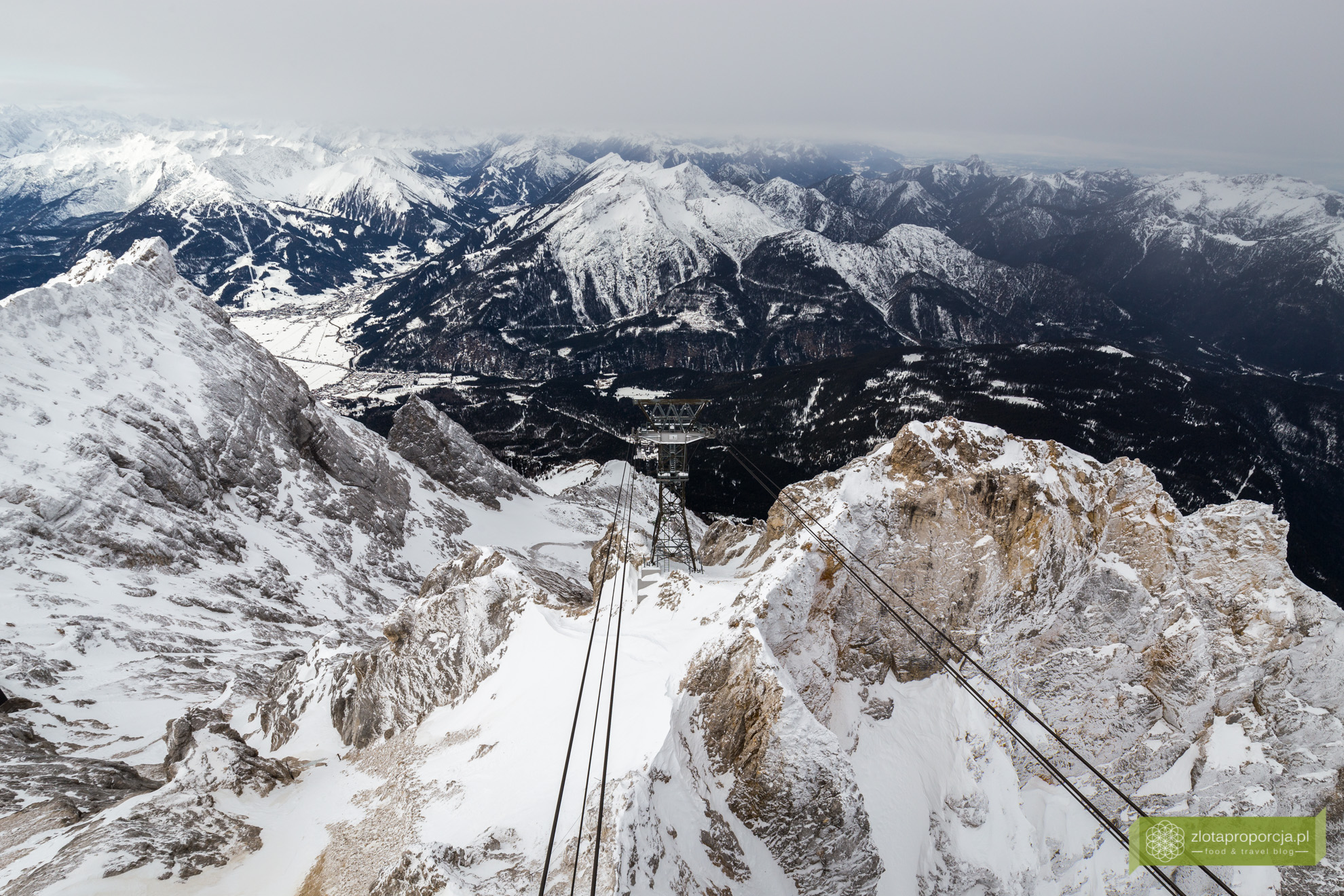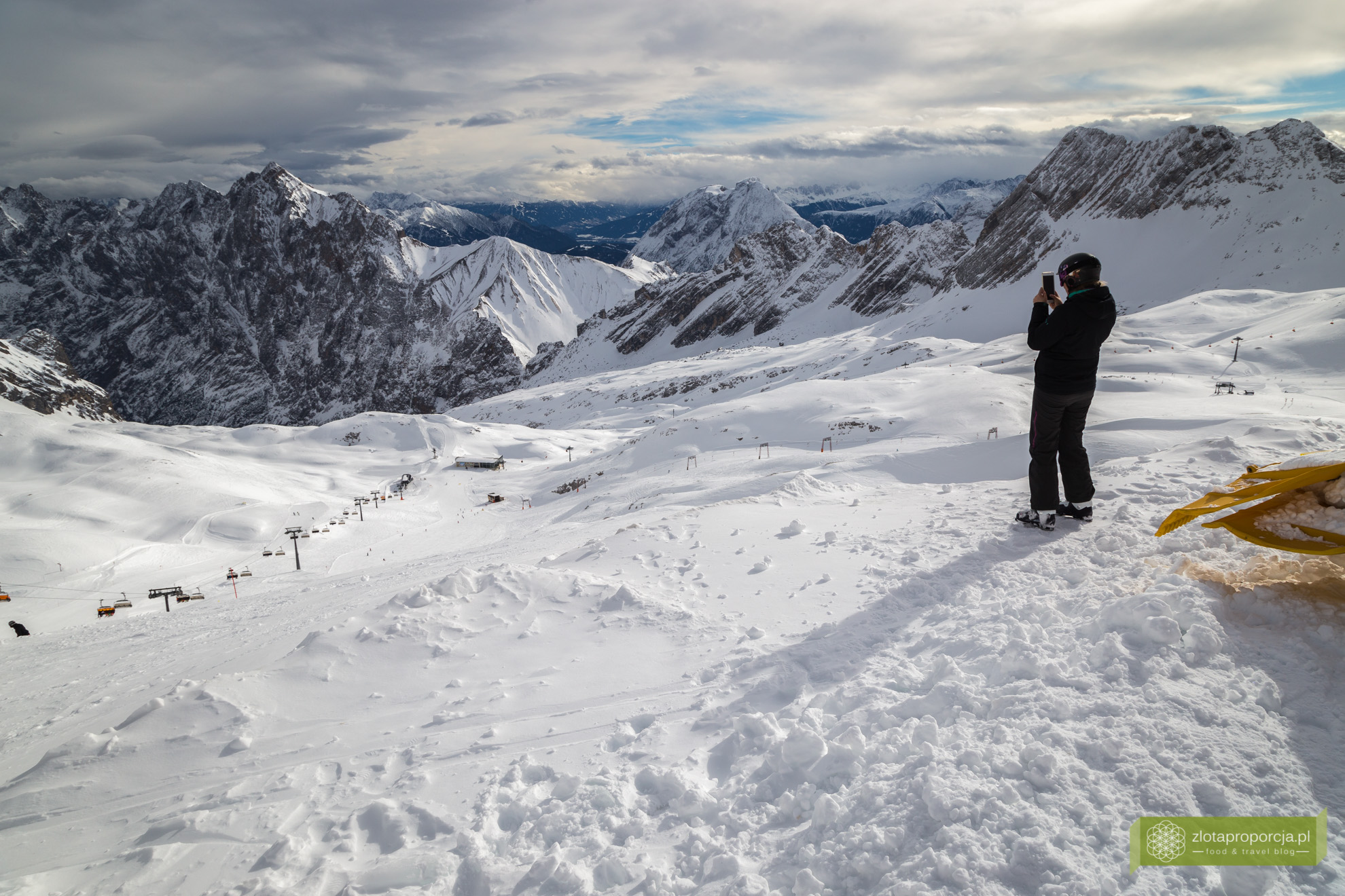 Wjeżdżaliśmy od strony Garmisch-Partenkirchen i jeziora Eibsee, znajdującego się na 1000 metrów. 10 minut kolejką i znaleźliśmy się prawie 2 kilometry wyżej, na tarasie widokowym na 2950 metrach. Wiało potwornie. Staliśmy obok siebie i nie słyszeliśmy się ani trochę. Wiatr świstał wokół i bawił się śniegiem na górskich zboczach. Droga na szczyt była mocno oblodzona i zamknięta. Od wierzchołka Zugspitze dzieliło nas zaledwie 12 metrów przewyższenia. No cóż, nie tym razem. Na szczęście widoki były bajkowe także te kilkanaście metrów niżej.