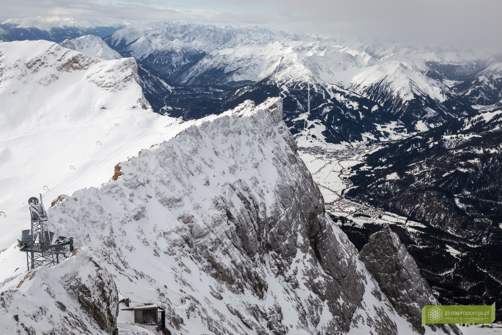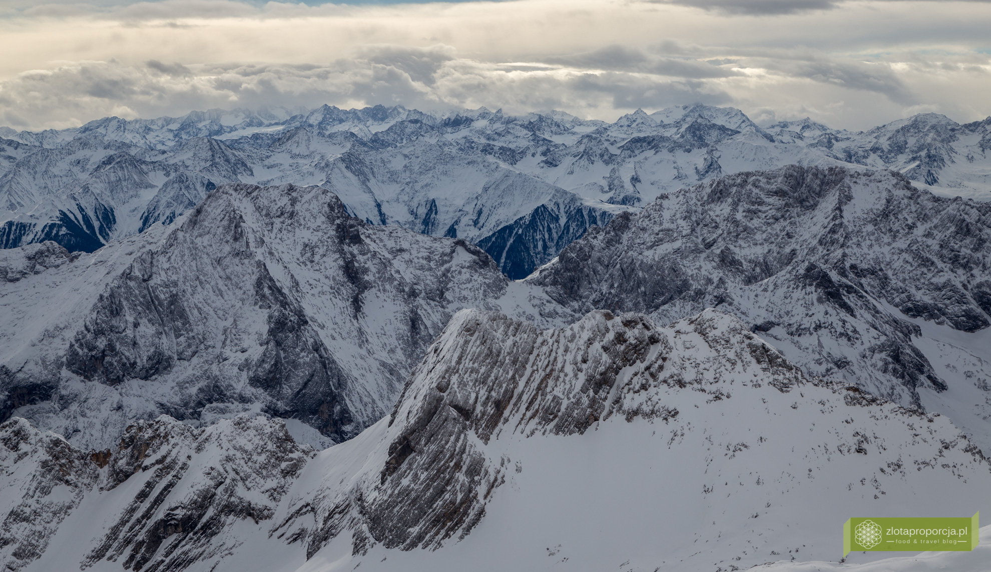 Z każdej strony wierzchołki ciągną się po horyzont aż w końcu nikną w chmurach, we mgle lub gdzieś za horyzontem. Jeżeli masz dużo szczęścia i przejrzyste niebo zobaczysz nie tylko niemieckie i austriackie szczyty, ale możesz także dostrzec te szwajcarskie albo włoskie. Przy dobrych wiatrach widoczność sięga 250 kilometrów i naliczyć można ponad 400 wierzchołków. Ale tak dużo szczęścia tym razem nie mieliśmy. Spojrzeliśmy „jedynie” na Austrię, która znajduje się przysłowiowy rzut beretem. a może nawet bliżej, bo z Zugspitze można zjechać kolejką wprost do austriackiego Tyrolu.
