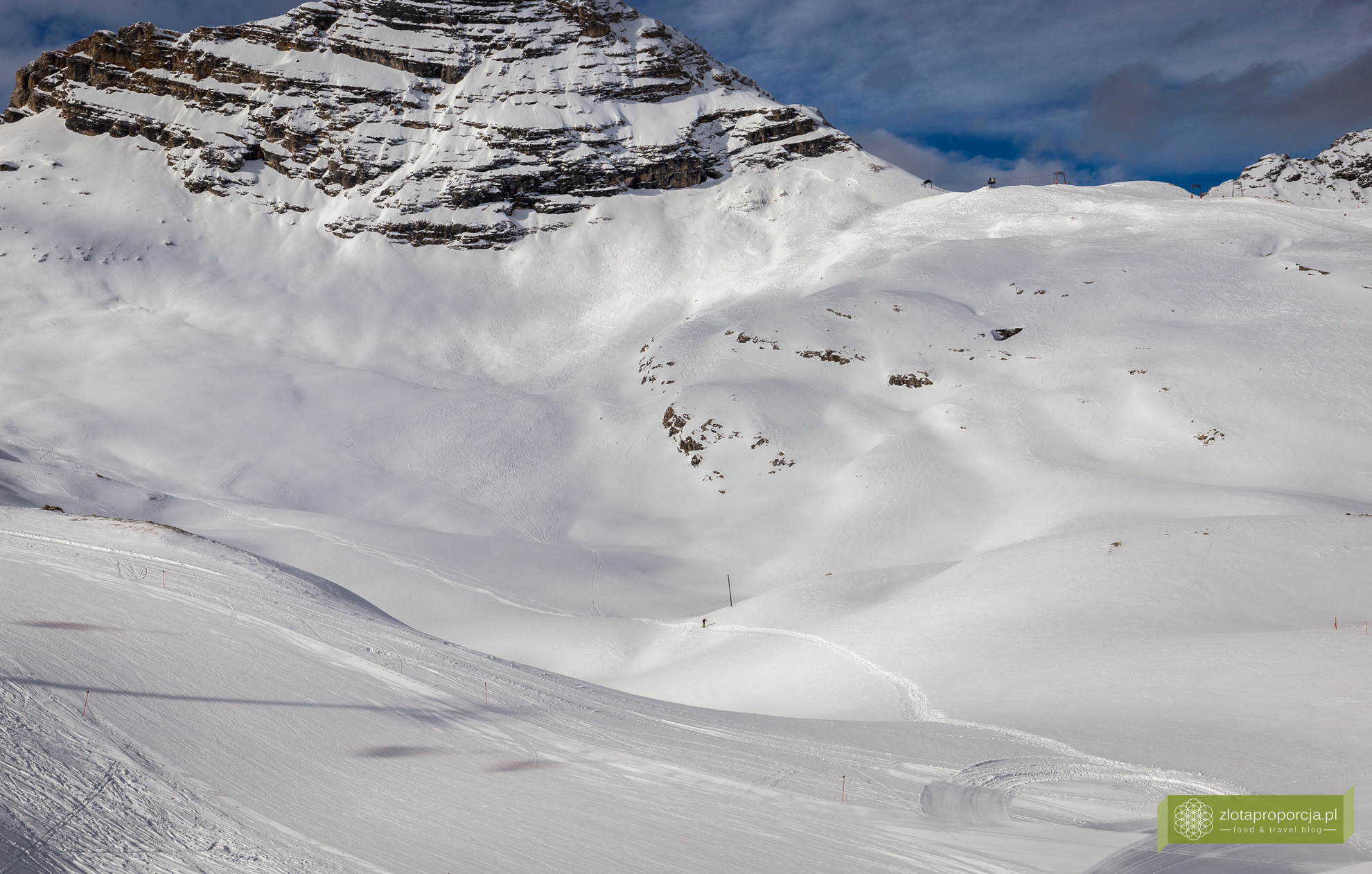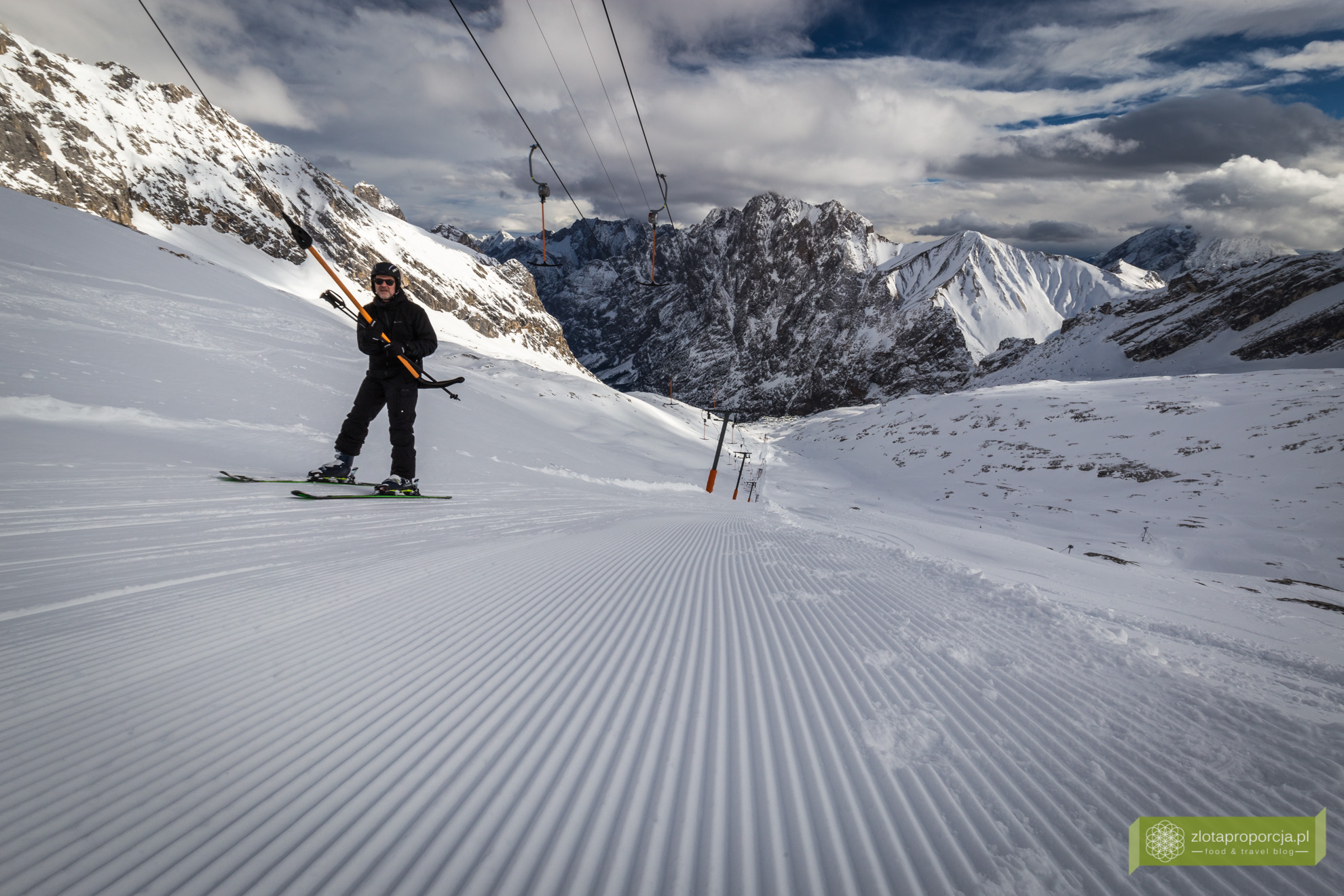 Warunki trafiły się nam znakomite – ponad 2 metry świetnie wyratrakowanego, śniegowego puchu, zero wiatru, kilka stopni na minusie oraz słońce opalające nasze twarze. Do tego zaskakujące pustki, zdecydowanie więcej osób spotkaliśmy na trasach Garmisch Classic, co podobno jest tu regułą. Pogoda popsuła się dopiero późnym popołudniem, kiedy chmury zasłoniły cały płaskowyż, a widoczność spadła do kilku metrów. Jazda w tych warunkach zrobiła się mało przyjemna, powoli udaliśmy się więc do kolejki, na szczęście była to końcówka dnia i straciliśmy tylko kilka zjazdów. Natura Zugspitze, o której słyszeliśmy wcześniej, pokazała nam swoje różne oblicza. Kiedy więc jeździć na lodowcu? Jeżeli jest słonecznie jeździ się tu bajecznie, ale jeżeli dzień jest pochmurny, a szczyt ukryty jest w chmurach, lepiej tego dnia udać się na stoki Garmisch Classic. Może być też odwrotnie, kiedy dolina spowita jest gęstą mgłą lub niskimi chmurami, na Zugspitzplatt może być piękna pogoda i lampa.