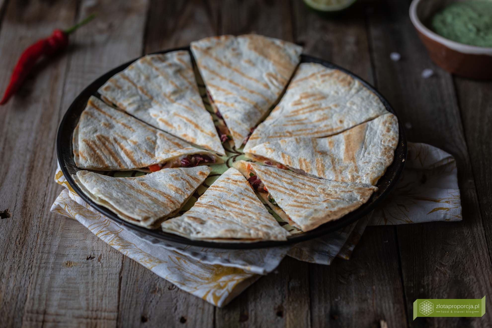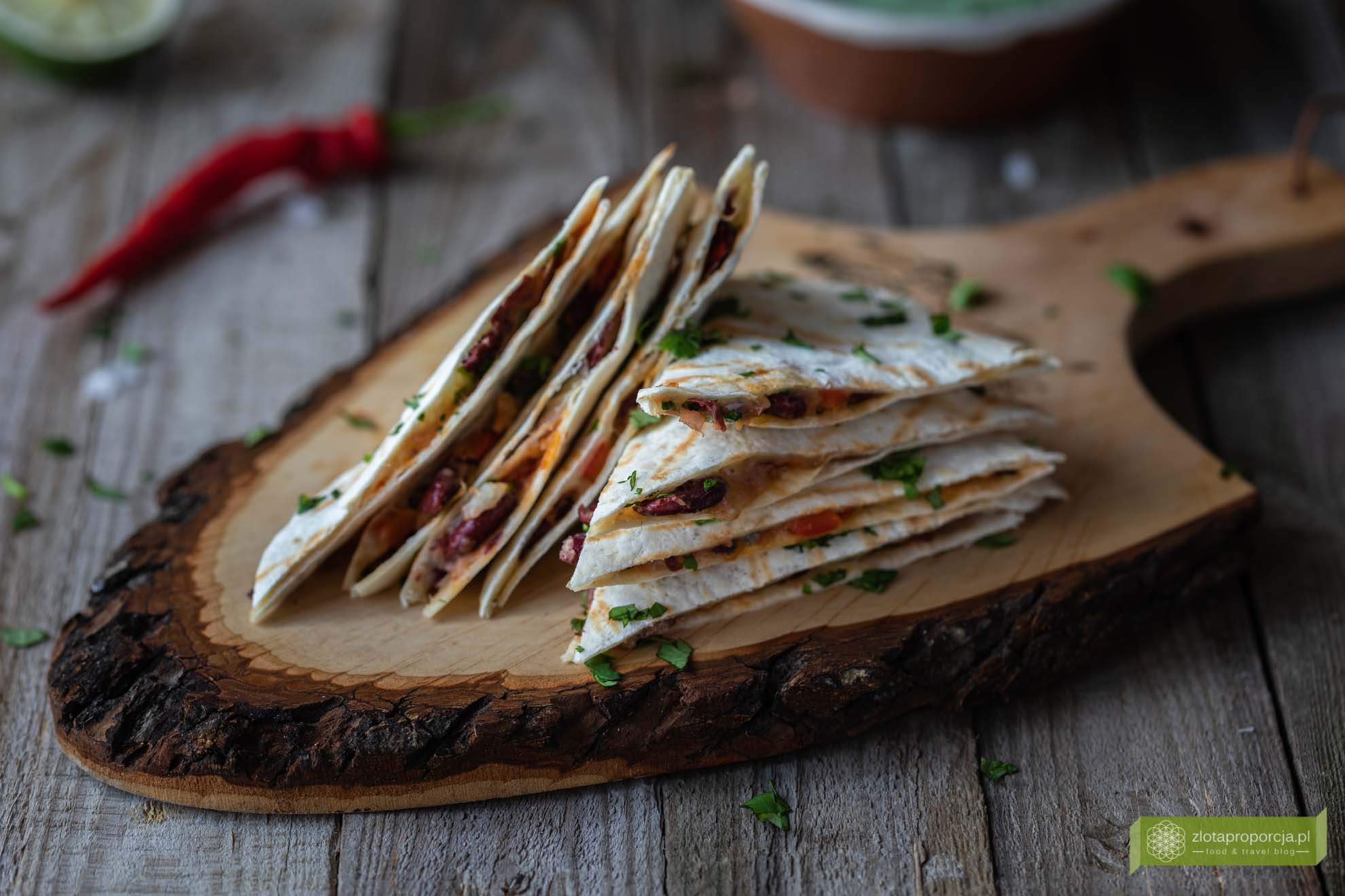 Quesadilla z czerwoną fasolą, serem i warzywami to prosty oraz szybki sposób na mały i większy głód. Quesadilla to w najprostszej wersji tortilla z mąki kukurydzianej lub pszennej z serem. Oprócz sera dodajemy do niej często farsz z czerwoną fasolą, czerwoną cebulą, ostrą i słodką papryką, pomidorem i świeżą kolendrą. Robimy ją na szybko po pracy, kiedy mamy ochotę na szybką i pożywną przekąskę lub podczas spotkania ze znajomymi. Quesadilla z czerwoną fasolą najczęściej jemy z guacamole, inną meksykańską salsą lub po prostu ze śmietaną skropioną sokiem z limonki.