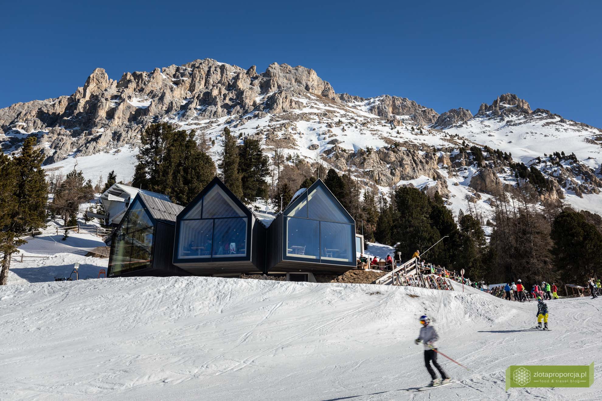 Bez cienia wątpliwości Oberholz to jedno z najpiękniej położonych miejsc w jakich kiedykolwiek jedliśmy. Schronisko zbudowano na 2096 metrach tuż przy poszarpanych wierzchołkach masywu Latemar. Dokładnie w tym miejscu, w którym powstał pierwszy wyciąg i pierwsza trasa w Obereggen. Ze schroniska jest fantastyczny widok nie tylko na Dolomity, ale także na Alpy. Z takim widokiem lunch czy przerwa na kawę, herbatę, bombardino to czysta przyjemność!