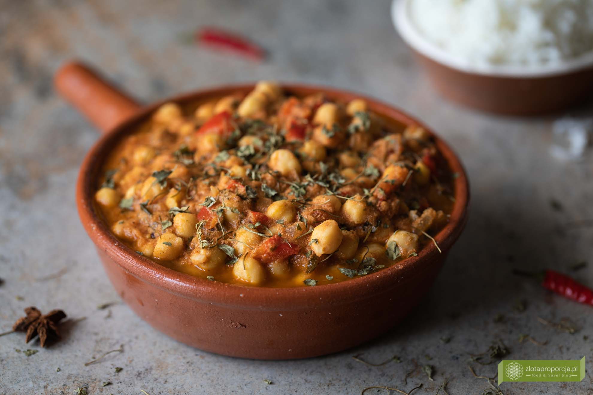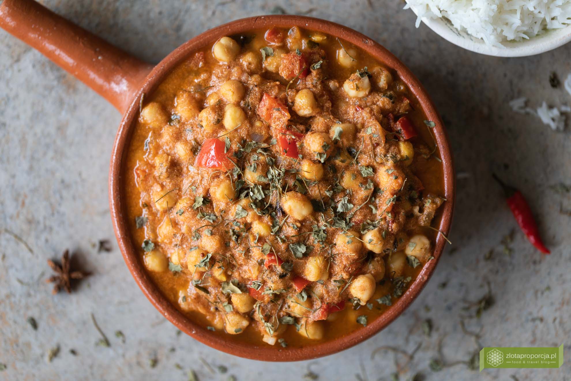 Gotuj na małym ogniu przez 15-20 minut, co jakiś czas mieszając. W międzyczasie ugotuj ryż, wstaw go w takim momencie, aby był gotowy razem z curry. Na koniec dopraw curry jedną łyżeczką garam masala oraz, jeżeli jest potrzeba, ostrą papryką. Curry z ciecierzycy najlepiej smakuje z ryżem basmati. Bardzo polecamy ryż marki Tilda, który jest naprawdę dobrej jakości. Przed podaniem posyp curry odrobiną liści kozieradki. Smacznego!
