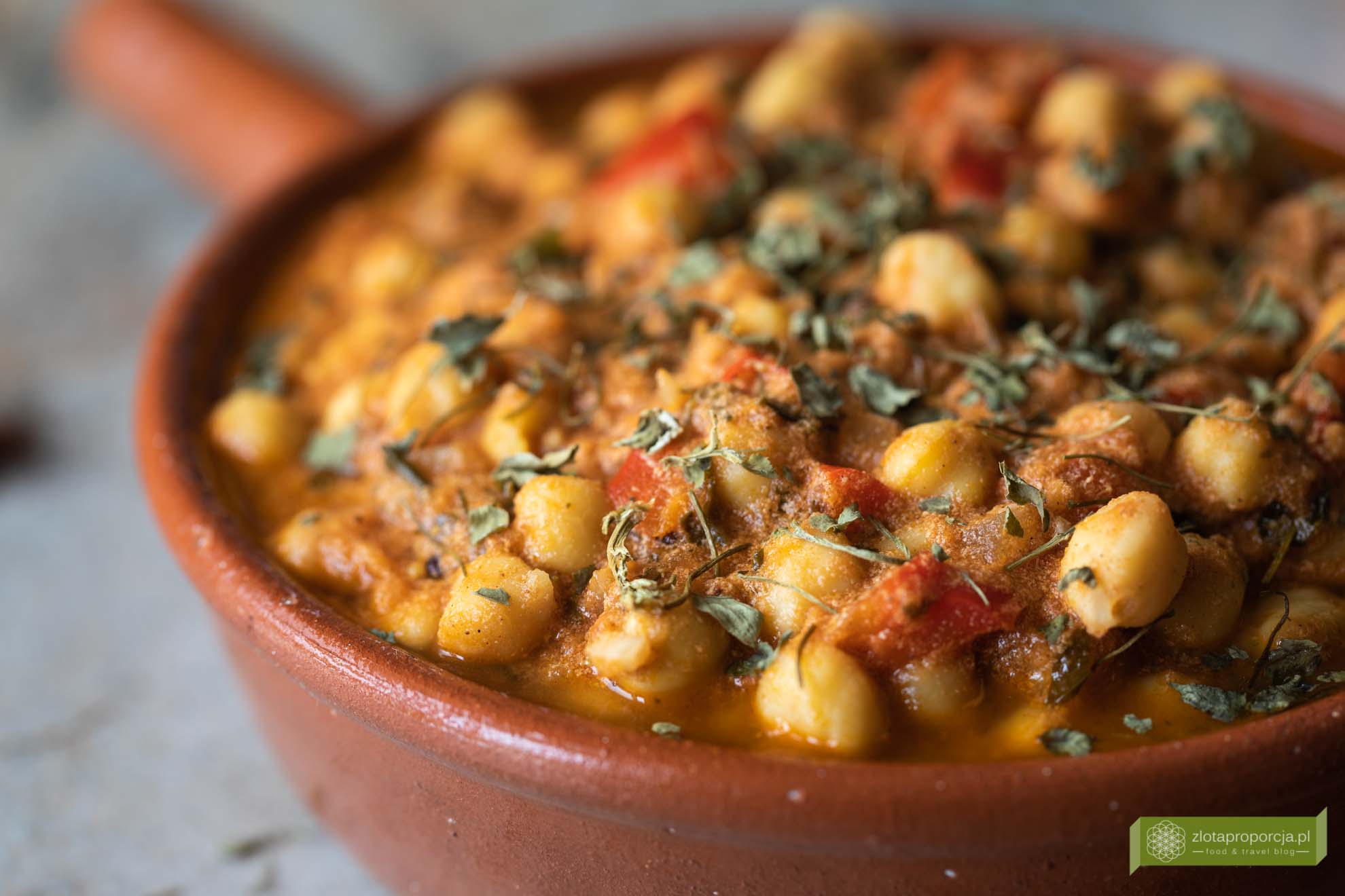 Curry z ciecierzycy z pomidorami, papryką i liśćmi kozieradki