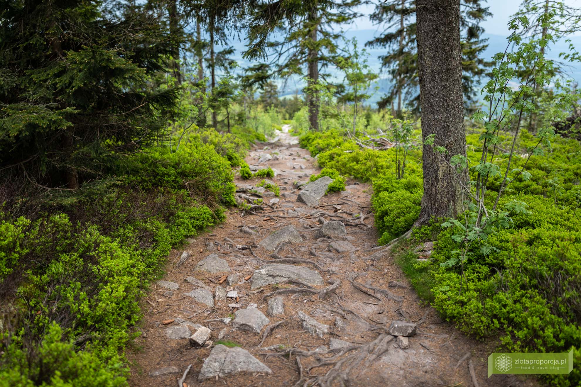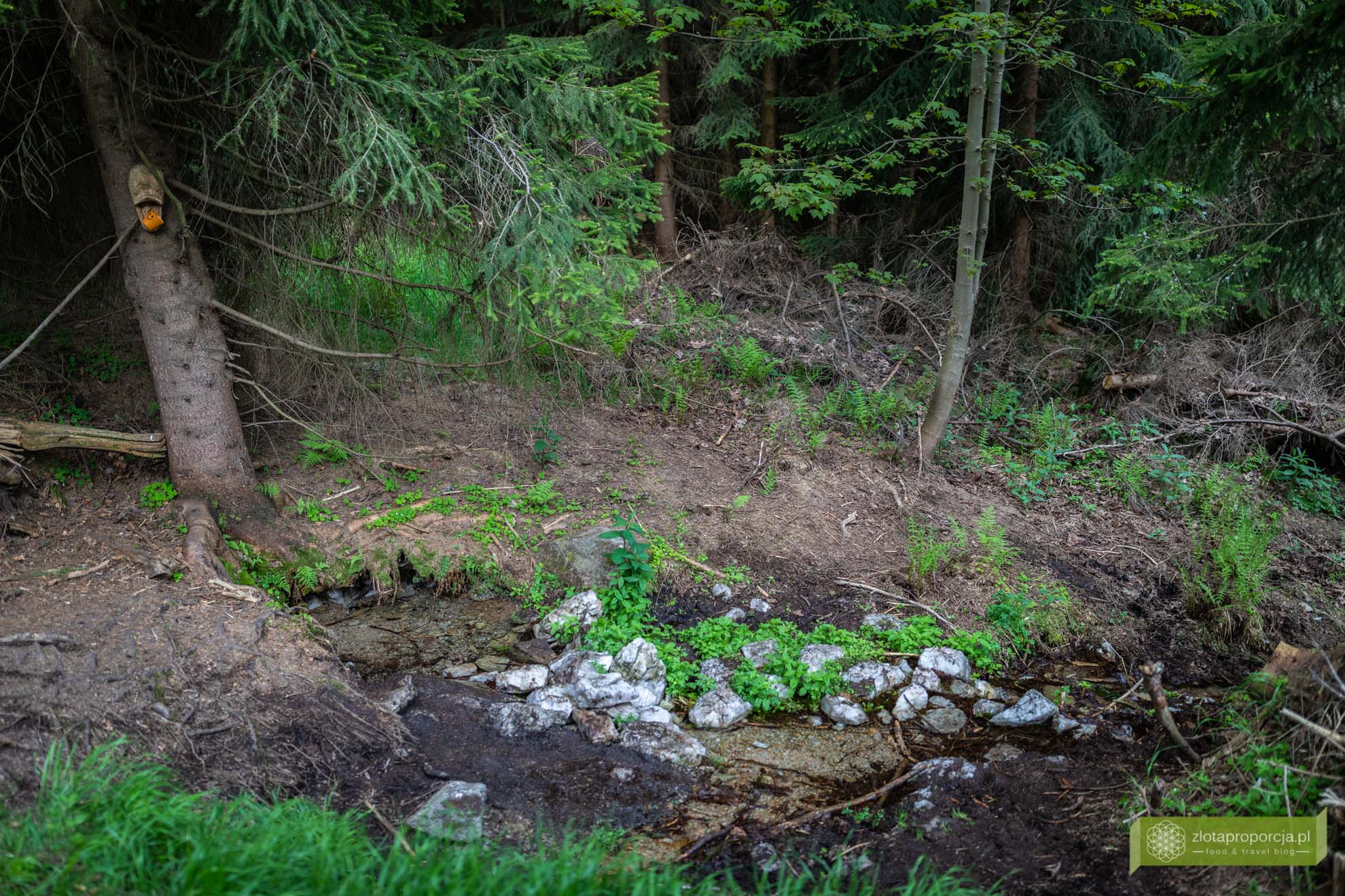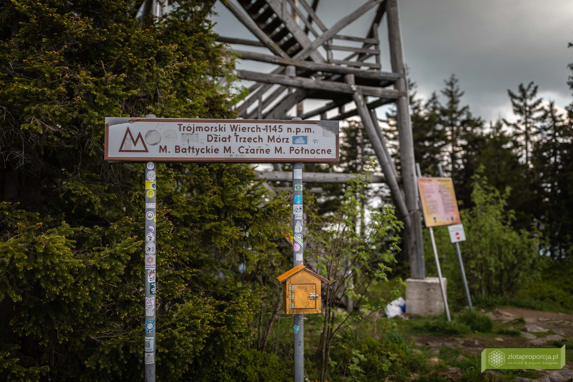 Najpopularniejszy szlak na Trójmorski Wierch prowadzi z Jodłowa, a dokładnie z bezpłatnego parkingu znajdującego się w Jodłowie. Początkowy odcinek to bardzo przyjemny i niezbyt wymagający spacer leśną drogą czerwonym, a potem czerwono-żółtym szlakiem. Podejście jest naprawdę łagodne i nie powinno sprawić problemu. Jeżeli tak jak my, zatrzymacie się w Potoczku, możecie wejść na żółty szlak bezpośrednio z tej maleńkiej, ale jakże urokliwej miejscowości, skracając dystans do wejścia na szczyt.