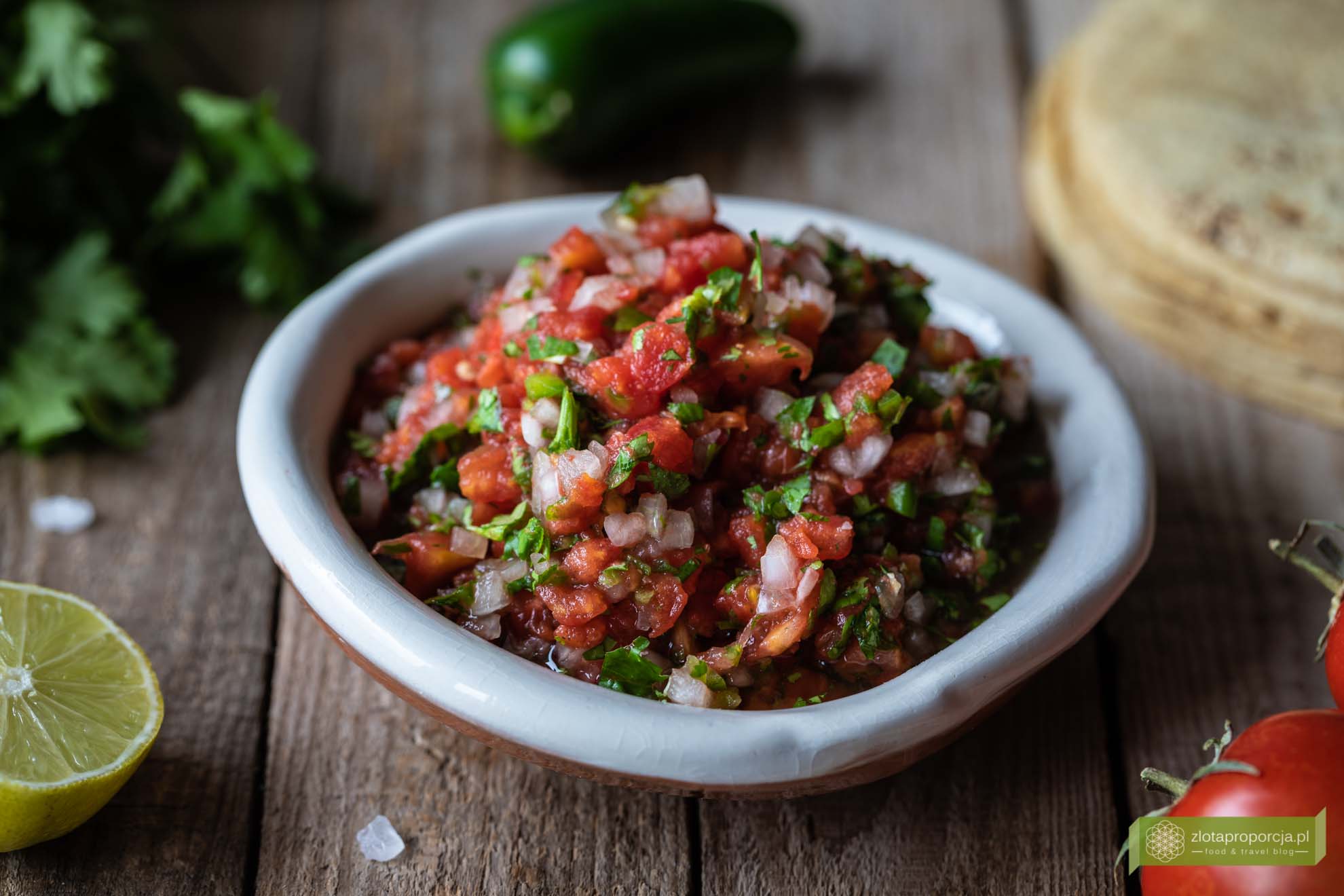 Jak wspomnieliśmy na wstępie ta meksykańska salsa ze świeżych pomidorów jest niezwykle prosta do zrobienia. Przyrządzasz ją z pomidorów, ostrej papryki, białej cebuli, limonki, świeżej kolendry i soli. Te kilka składników wystarczy, aby zrobić niezwykle pożywną, pełną smaku salsę. Oczywiście dobre jakościowo składniki mają tu znaczenie. Pomidory powinny być dojrzałe i niezbyt wodniste, najlepiej w tym przepisie sprawdzą się ich podłużne odmiany. Do salsa fresca tradycyjnie dodaje się świeżą papryczkę jalapeno lub serrano, te dwie odmiany polecamy najbardziej. Serrano jest zdecydowanie ostrzejsza od jalapeno, więc jeżeli nie lubisz jeść na ostro, to wybierz jalapeno lub dodaj mniej papryczki. Kolendra powinna być natomiast jak najświeższa i aromatyczna.