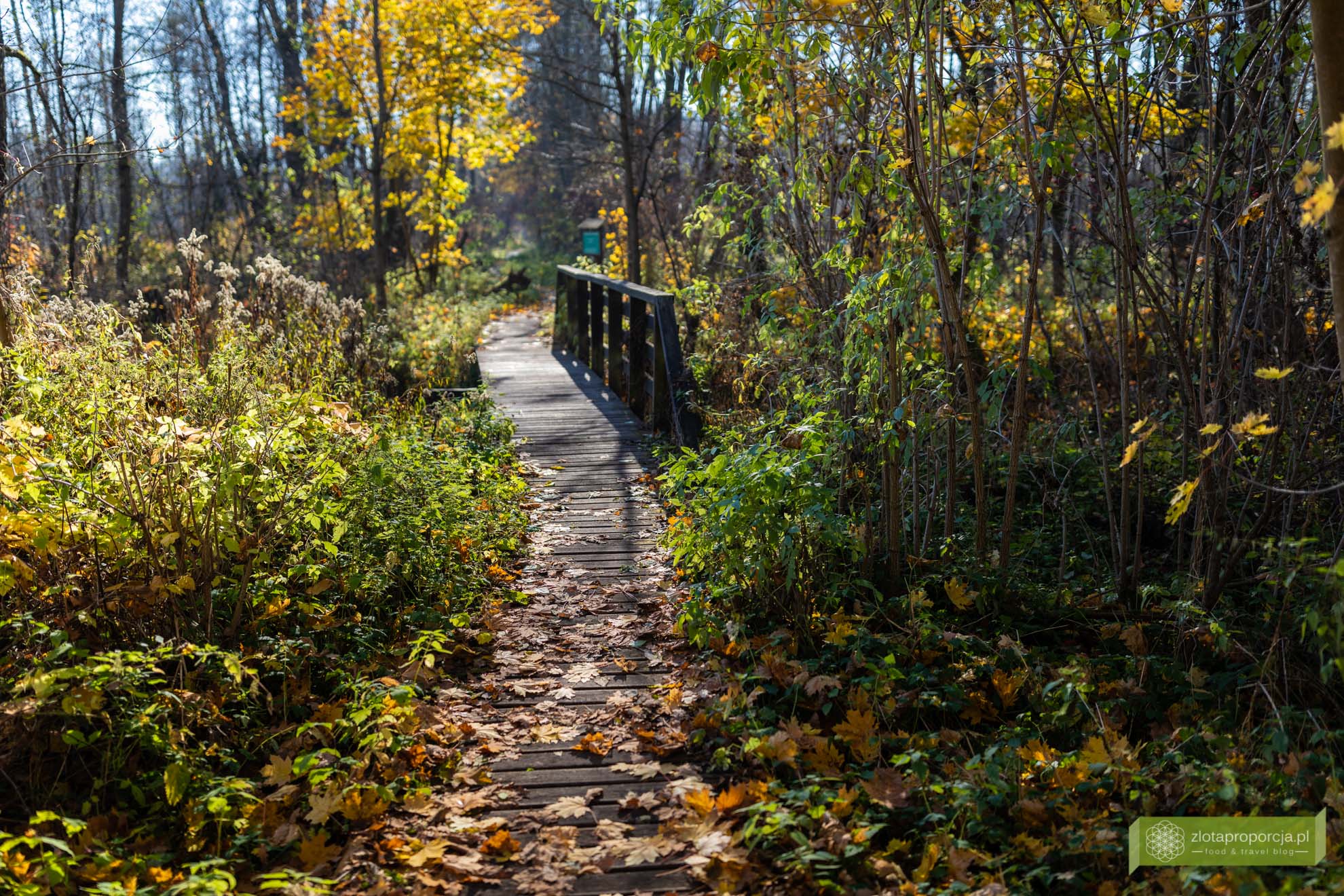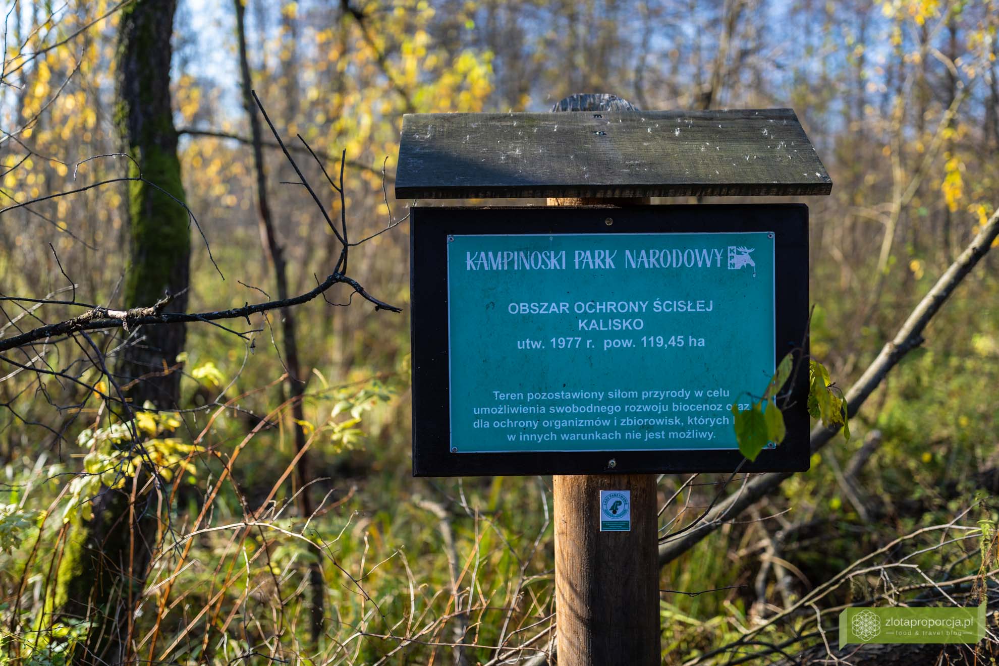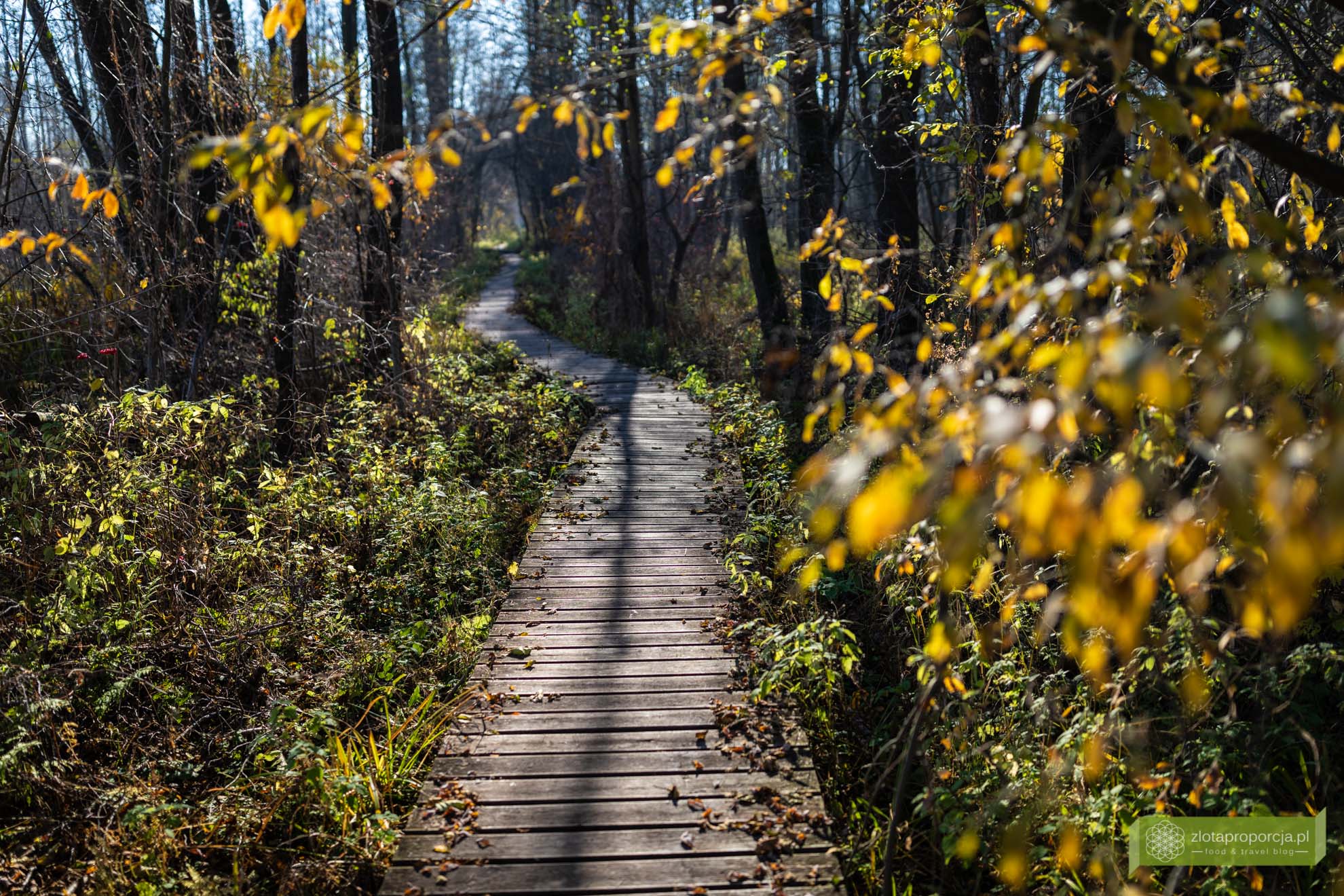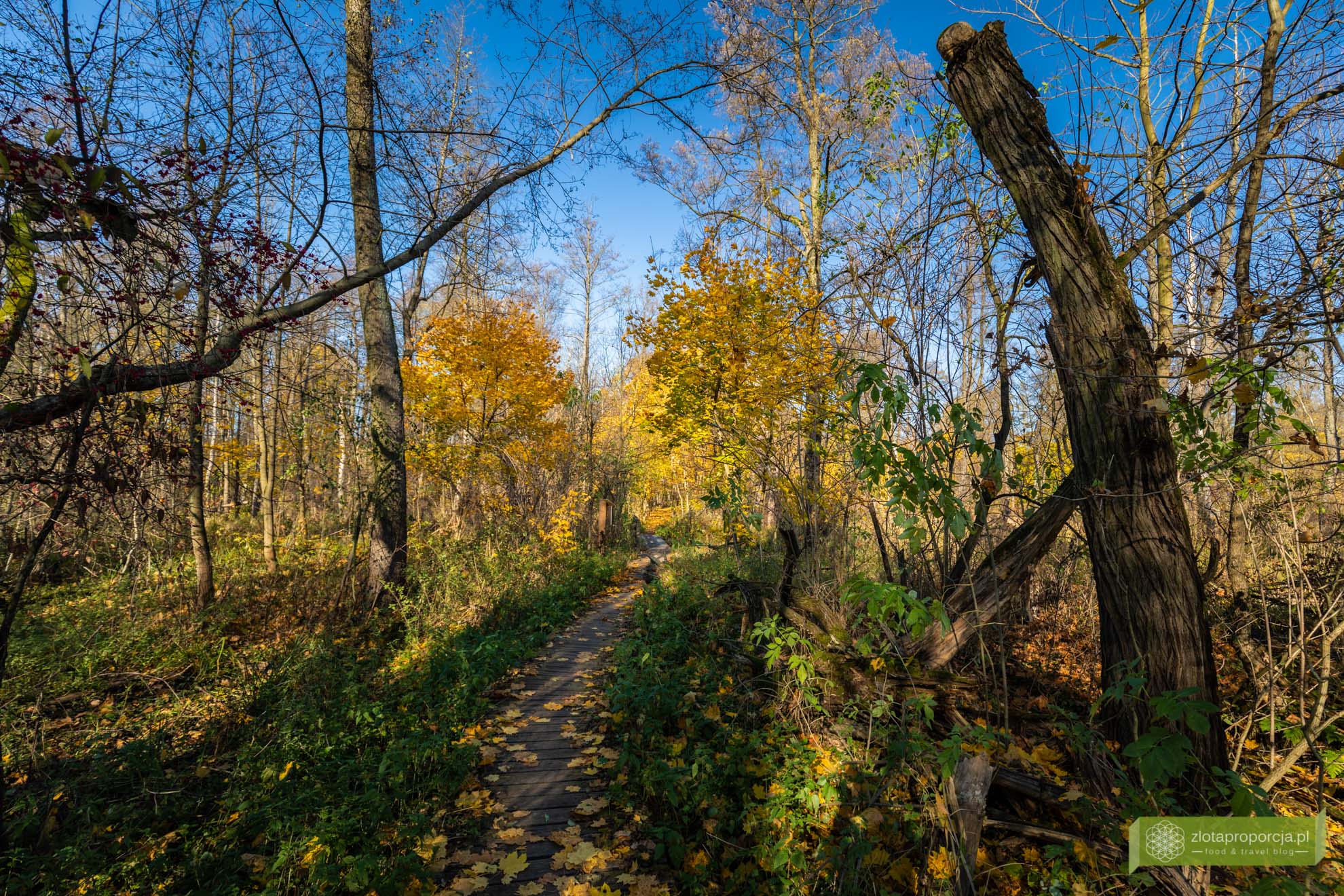 Kładka Zaborowska to najdłuższa kładka w Kampinoskim Parku Narodowym. Kilka lat temu poprowadzono ją nad rozlewiskiem Kanału Zaborowskiego przez obszar ochrony ścisłej Kalisko. Wokół jest dziko, cicho i całkiem pusto. Kładka Zaborowska wygląda bardzo urodziwie właśnie teraz w soczystych kolorach jesieni. Na wejściu na kładkę czekał na nas piękny liściasty dywan o złotym kolorze. Dalej było również pięknie!