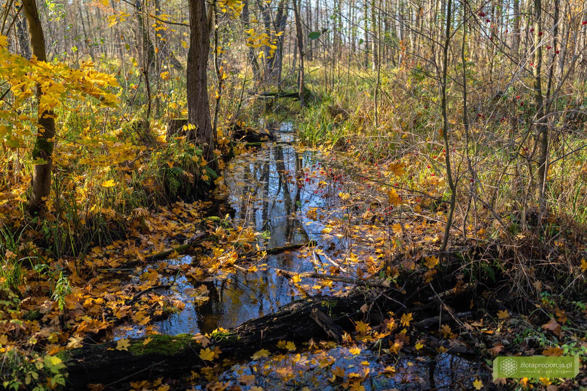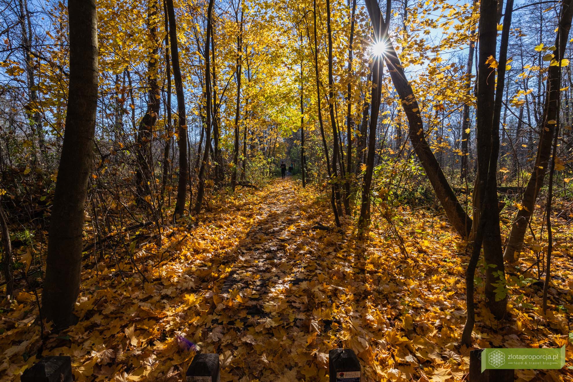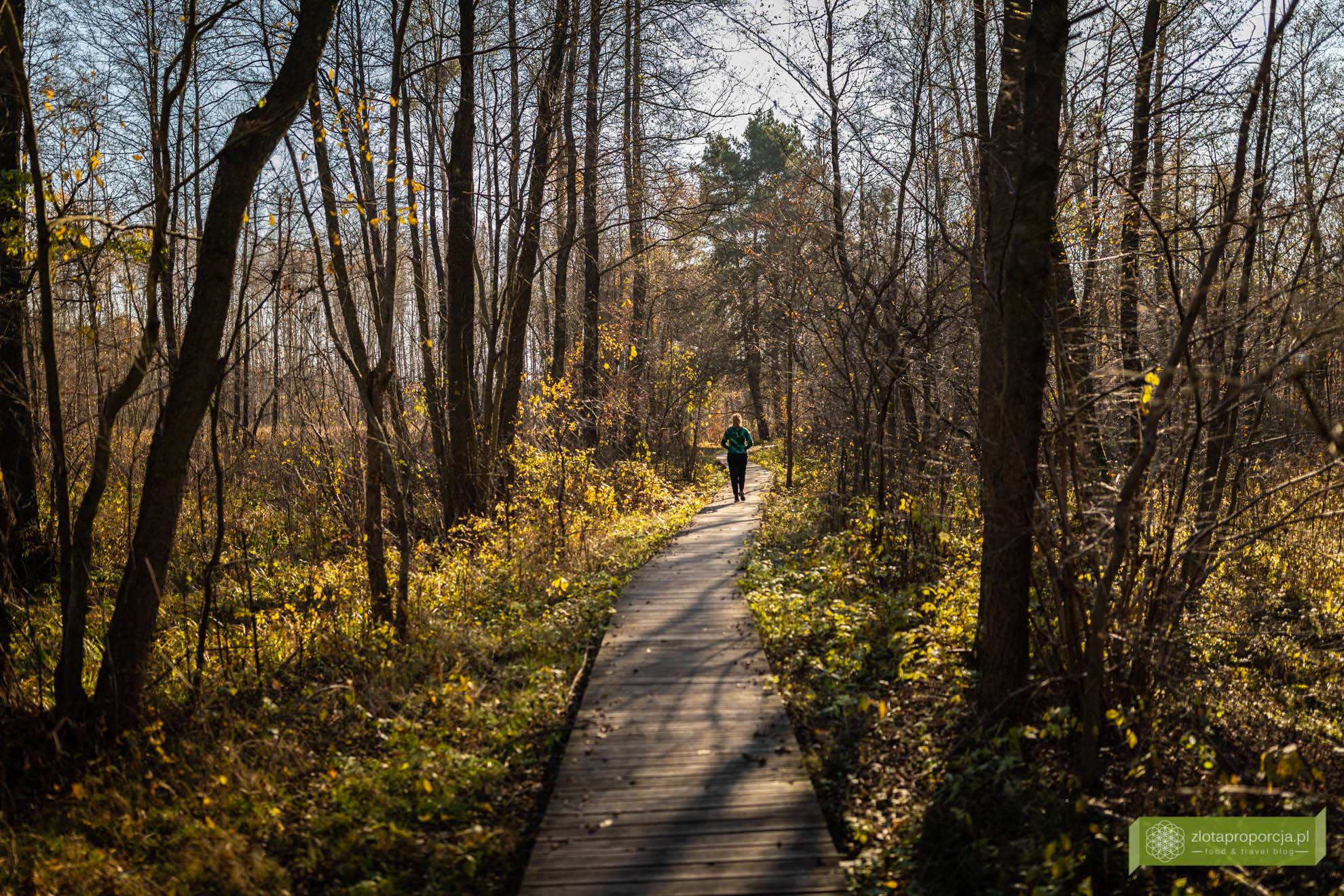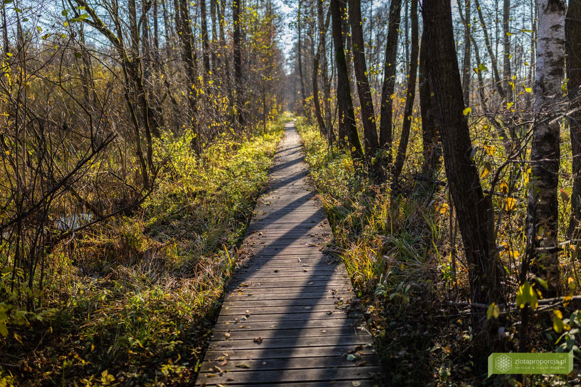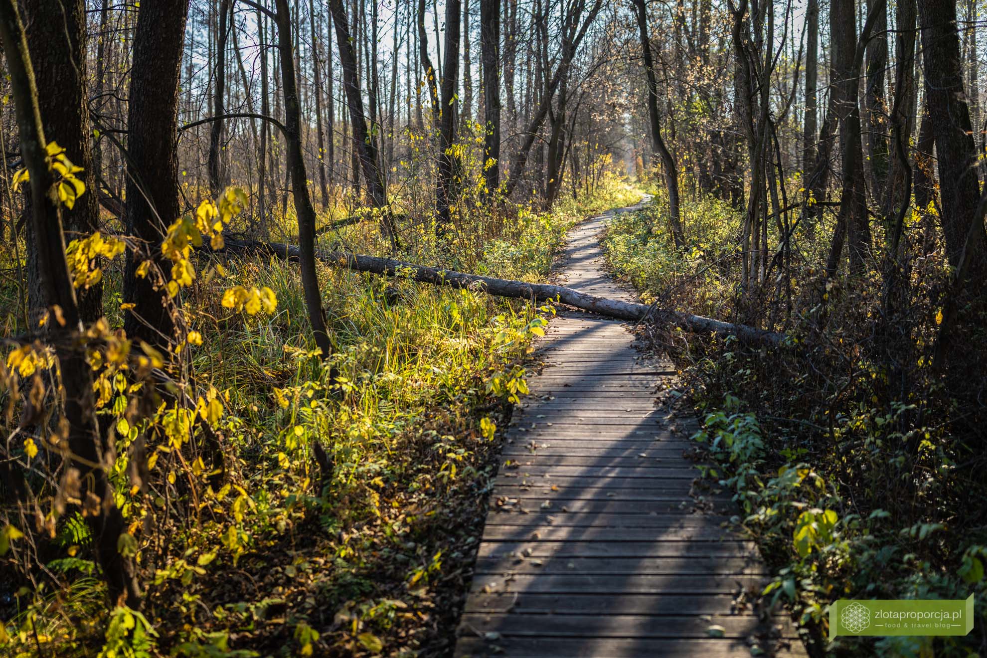 Kładka Zaborowska to najdłuższa kładka w Kampinoskim Parku Narodowym. Kilka lat temu poprowadzono ją nad rozlewiskiem Kanału Zaborowskiego przez obszar ochrony ścisłej Kalisko. Wokół jest dziko, cicho i całkiem pusto. Kładka Zaborowska wygląda bardzo urodziwie właśnie teraz w soczystych kolorach jesieni. Na wejściu na kładkę czekał na nas piękny liściasty dywan o złotym kolorze. Dalej było również pięknie!