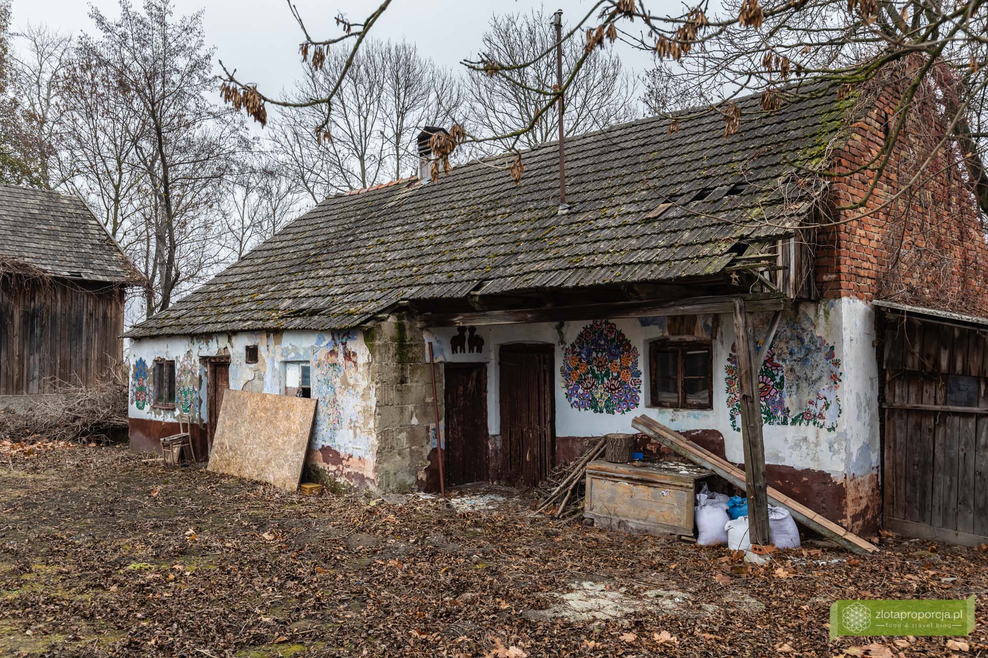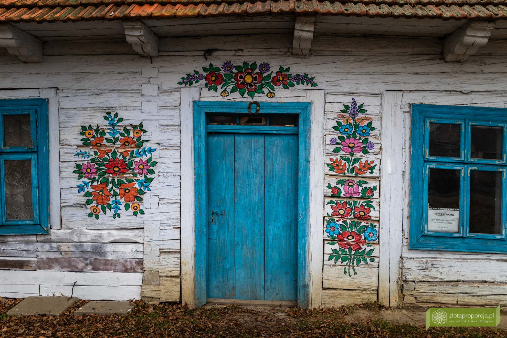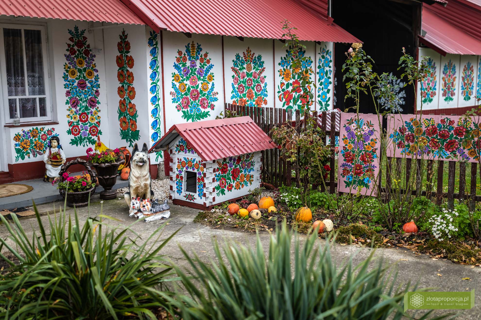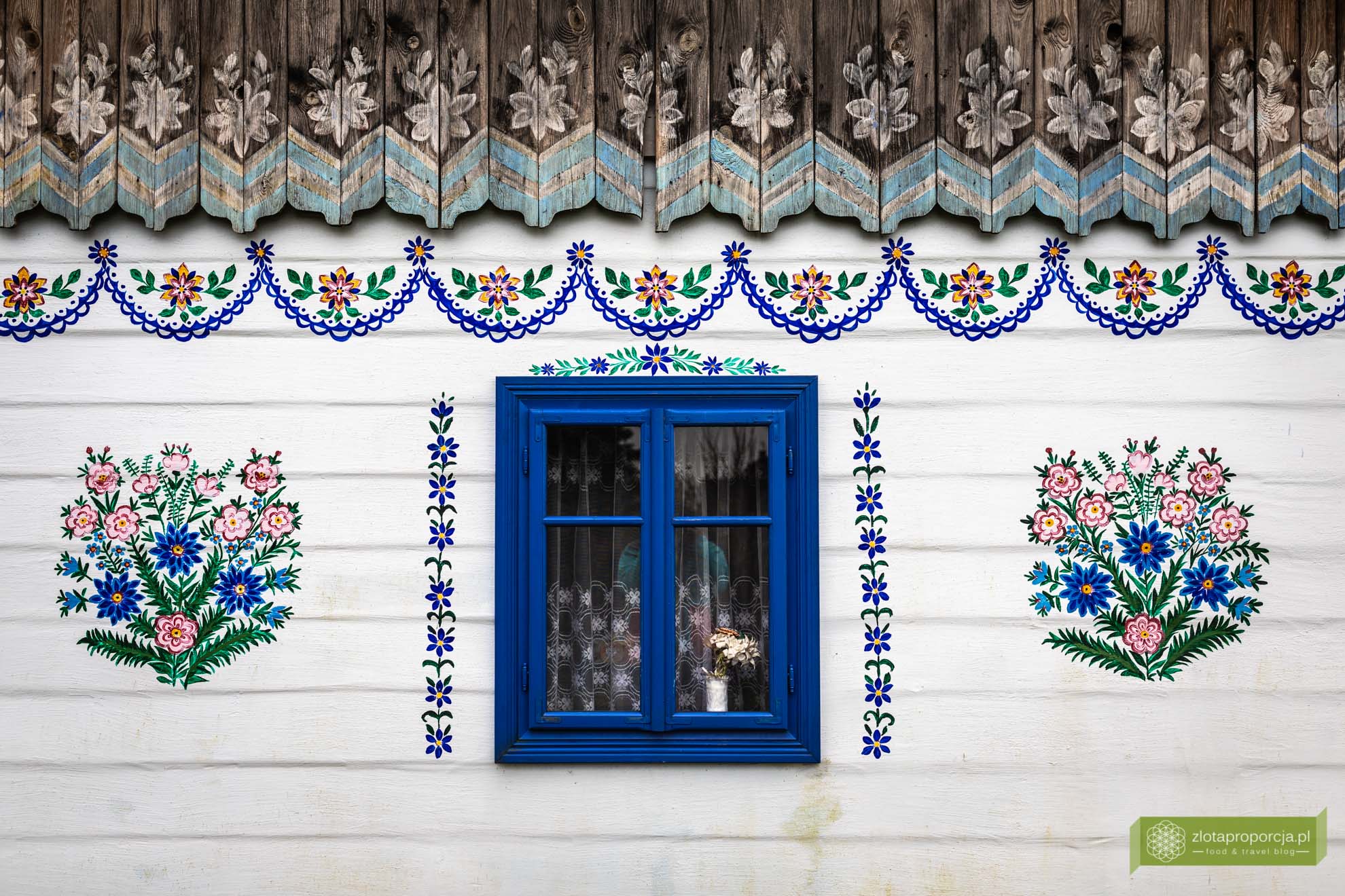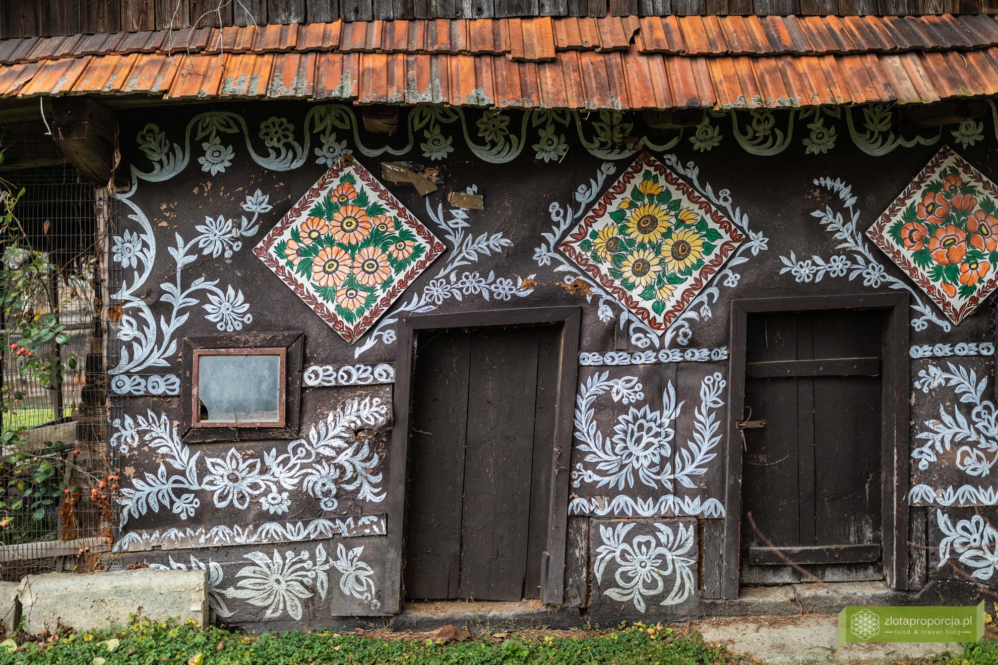 Odwiedzając Zagrodę Felicji Curyłowej na pewno zwrócicie uwagę na chatę znajdującą się po drugiej stronie drogi. To jedna z kilkunastu zdobionych chat rozrzuconych po całym Zalipiu. Bowiem nie cała wieś jest zdobiona i malowana. Część z zabudowań ma jedynie zalipiańskie akcenty w postaci zdobionych studni, bud czy pojedynczych elementów na elewacji. Część nie ma ich w ogóle. Jeżeli więc spodziewacie się zobaczyć malowaną wieś, w której każda chata jest kolorowa, możecie się rozczarować. Aby zobaczyć ozdobione chaty, trzeba udać się na dłuższy spacer po wsi.