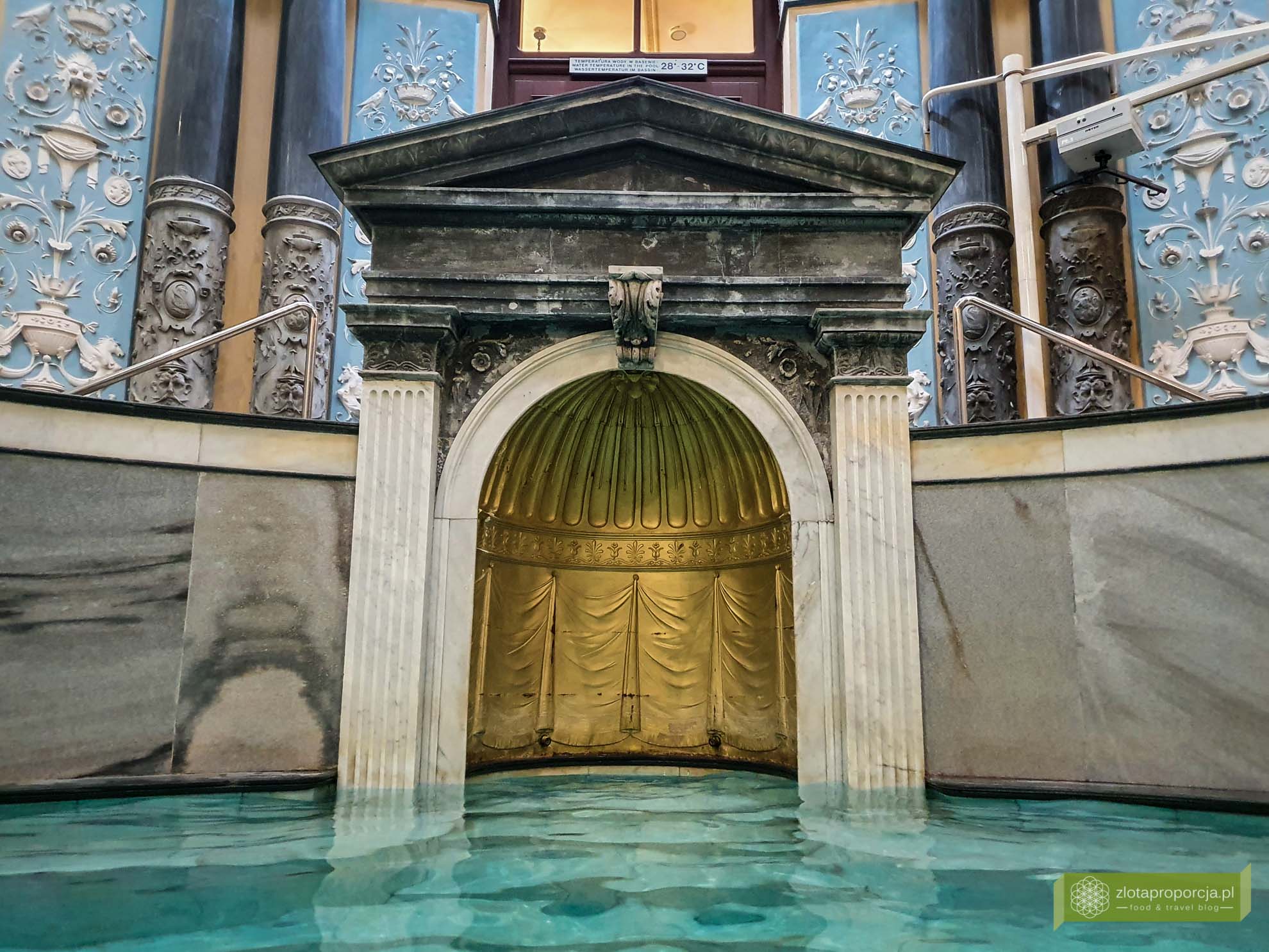 Sama kąpiel trwa dokładnie 30 minut. Trzeba pojawić się 10 minut wcześniej, w przeciwnym razie można nie zostać wpuszczonym do środka. Woda w basenie ma według oficjalnych informacji od 28 do 32 stopni, podczas naszej kąpieli zdecydowanie jej temperatura była bliższa dolnej granicy. Szczerze mówiąc spodziewaliśmy się, że będzie trochę cieplejsza. Być może w zimie ze względu na otwartą konstrukcję basenu temperatura jest trochę niższa. Aby móc w pełni podziwiać architekturę basenu, na kąpiel najlepiej jest umówić się w godzinach dziennych i porannych. Po zmroku architektoniczne detale staja się mniej widoczne. Do tego dochodzą kwestie higieniczne – woda w basenie jest ponoć całkowicie wymieniana każdego dnia. Im wcześniejsza kąpiel, tym świeższa woda.