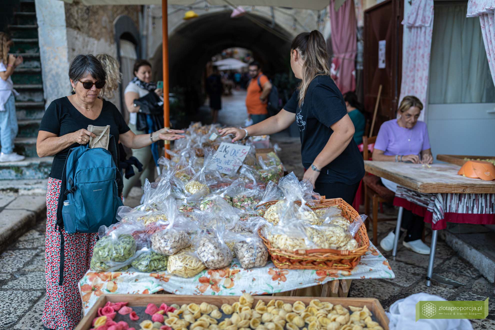 Szybkość z jaką Signore Orecchiette wyrabiają makaron robi ogromne wrażenie! Podobnie jak ich technika. Ciasto przeciągane jest po stolnicy nożem, po czym za pomocą kciuka i noża formowane są małe i większe uszka. Wygląda to niesamowicie. Makaron jest następnie osuszany w specjalnych sitach ustawionych przy stołach gospodyń na ulicy. Po osuszeniu jest on przekładany do plastikowych woreczków. Każdy może go kupić, ale pamiętajcie, że w plastikowej torebce nie przetrwa długo, dlatego lepiej jest zjeść go szybko!