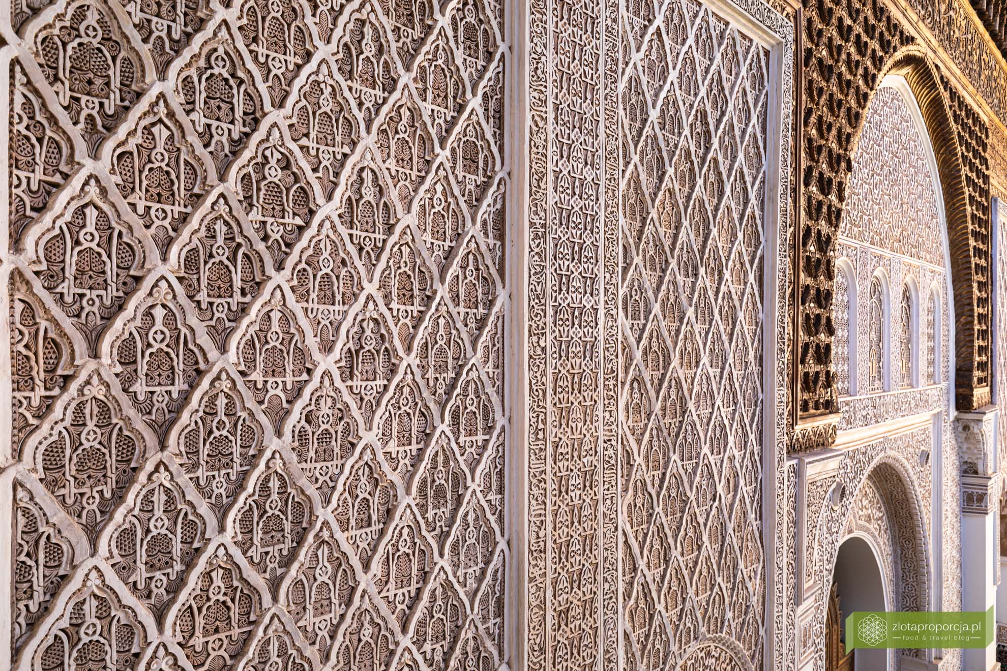 Ściany dużego dziedzińca i ozdobionych pomieszczeń pokryte są płytkami zellij, czyli mozaiką, oraz misternie rzeźbionymi sztukateriami. Wszystko jest spójne, a wiele ornamentów ma piękne, geometryczne kształty. Na dolnych częściach ścian położono płytki zellij, na wysokości oczu zlokalizowano fryzy kaligraficzne, czyli ozdobne napisy w języku arabskim, a środkowe i górne część ścian pokryto sztukaterią, która następnie przechodzą w drewniane elementy. Nic tu nie jest przypadkowe, wszystko jest misternie zaprojektowane i przemyślane. Efekt jest wspaniały, podziwiając kunszt architektoniczny i misterne detale można spędzić w medresie naprawdę wiele czasu. Można powiedzieć, że wiele wzorów się powtarza i właśnie to powtórzenie tworzy piękny i hipnotyzujący jeden wielki fraktal.