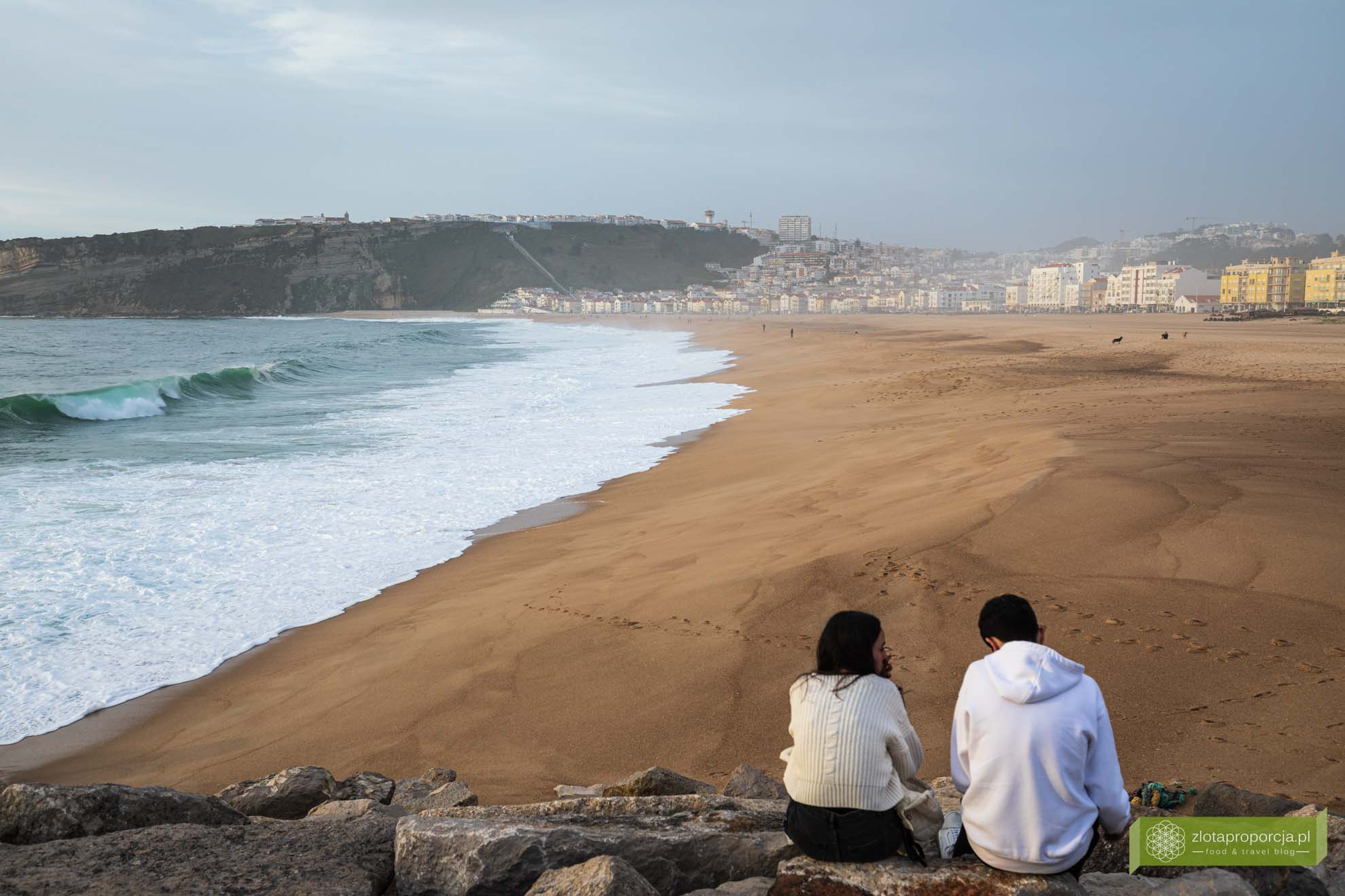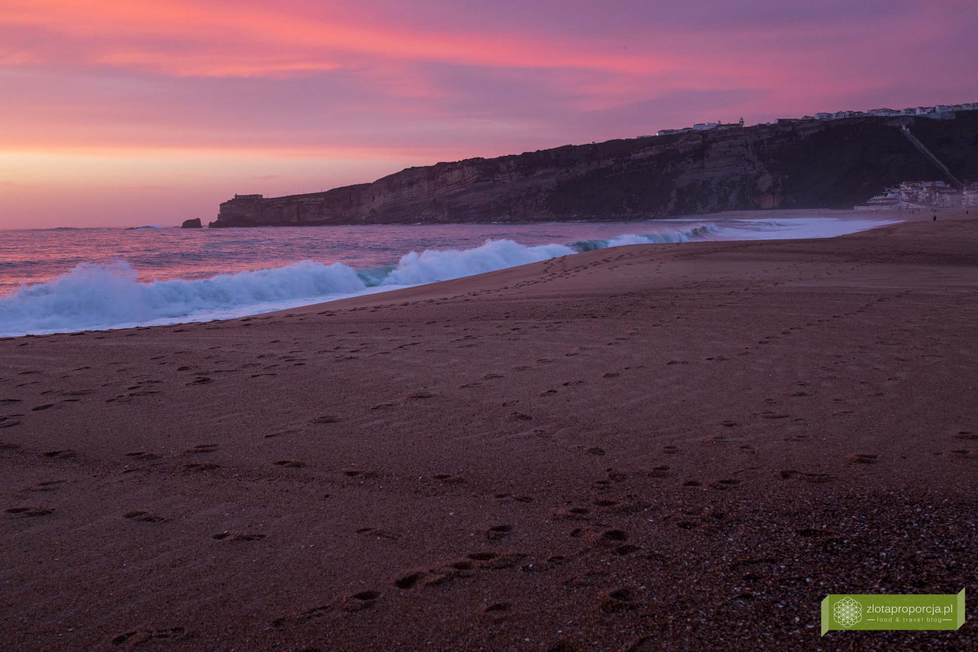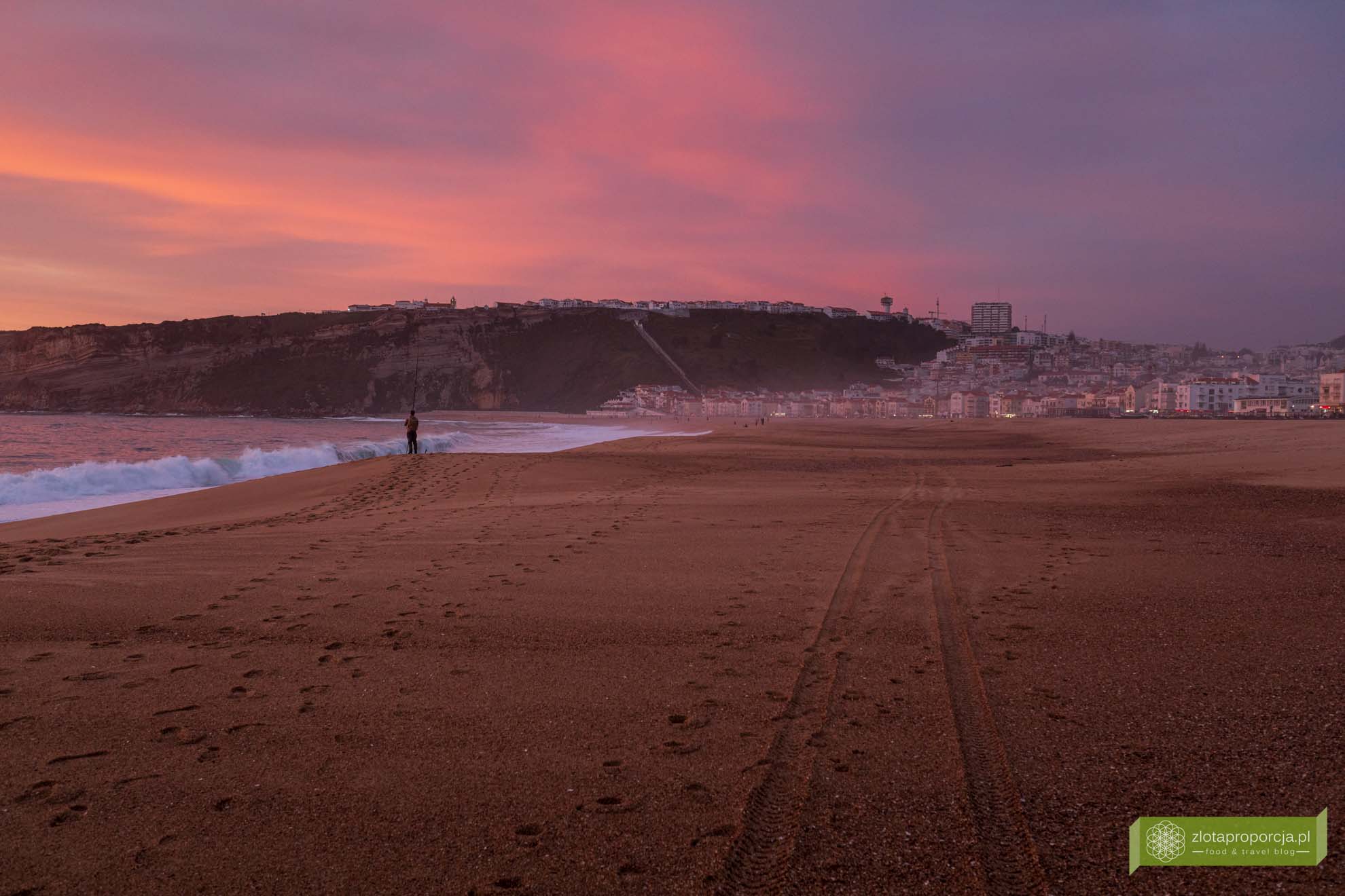 Praia de Nazare była pierwszym miejscem, które odwiedziliśmy w miasteczku. Przyjechaliśmy do Nazare późnym popołudniem, zostawiliśmy bagaże i od razu poszliśmy na spacer wzdłuż plaży. Zostaliśmy na niej do zachodu słońca, który zarówno tego, jak i kolejnego dnia był fenomenalnym spektaklem. To idealne miejsce do jego podziwiania, bowiem słońce zachodzi niemalże równolegle do plaży, także zachody słońca na Praia de Nazare to prawdziwa uczta dla oczu!