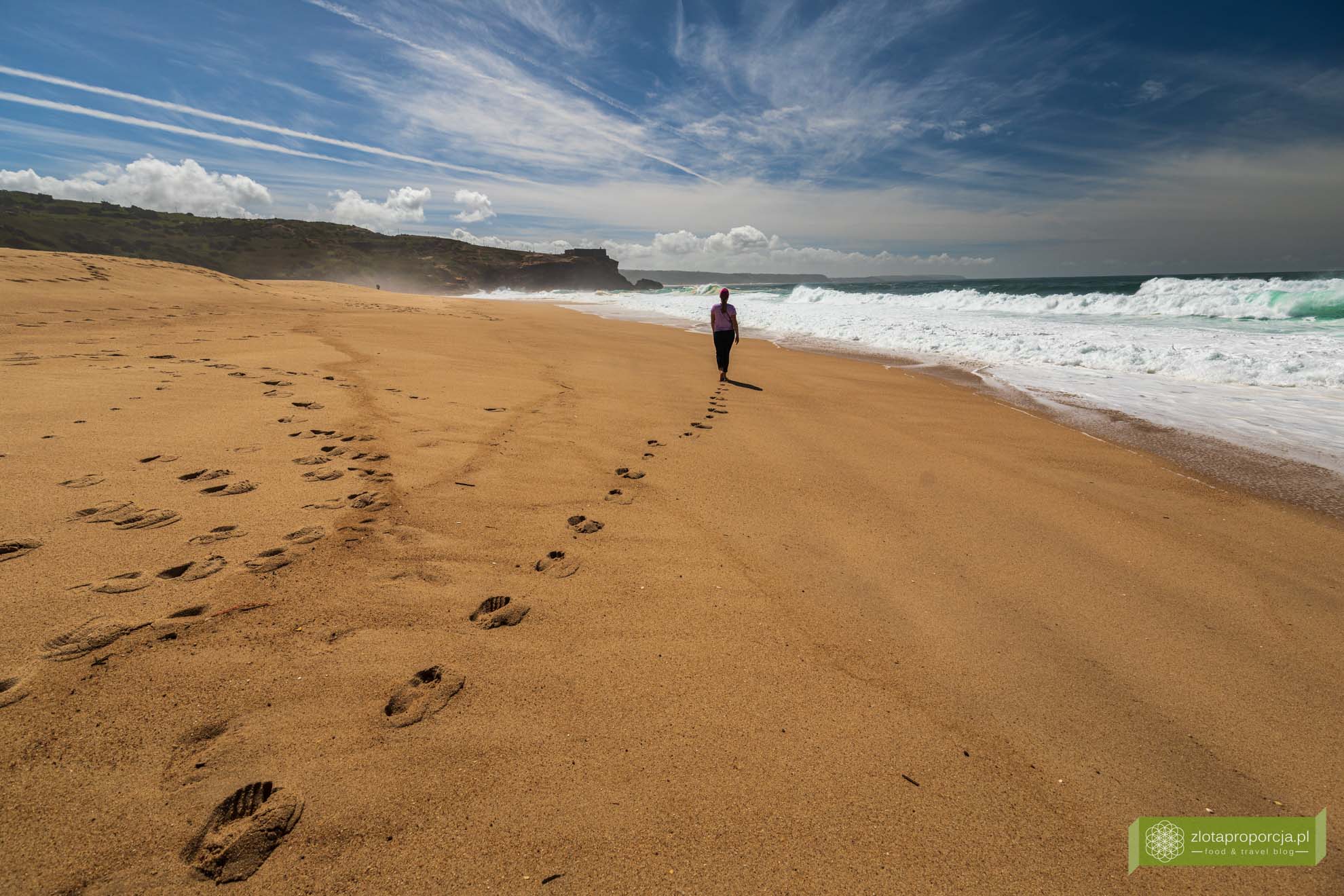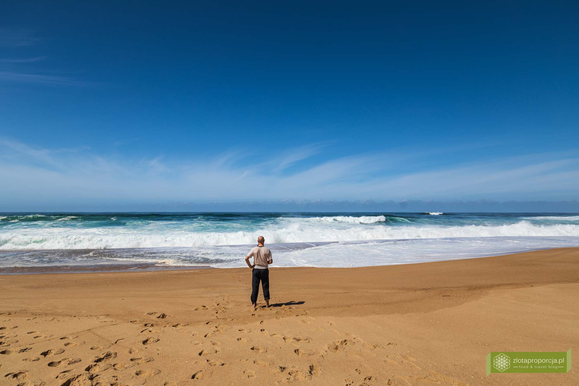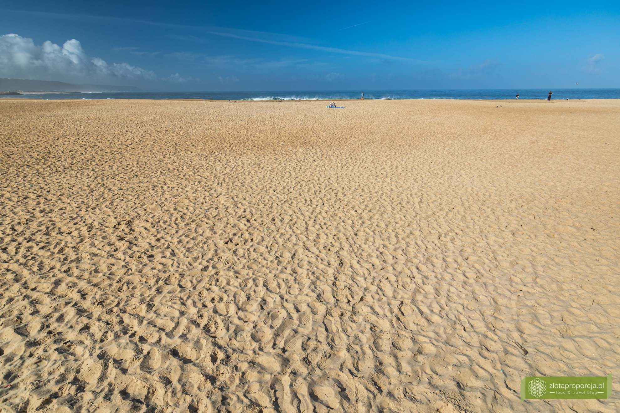 Sama plaża jest niezwykle urokliwa i urodziwa. Jest też dzika, bowiem w tej części miasteczka nie ma ani promenady ani zabudowań. Spacer po Praia do Norte to ogromna przyjemność! Spędziliśmy na niej sporo czasu i wróciliśmy po raz drugi kolejnego dnia, aby przed wyjazdem napatrzeć się na fale i pooddychać bogatym w jod powietrzem. Do fal trzeba podchodzić ze sporą dozą rezerwy, nawet jeżeli wydają się niezbyt wielkie. W kwietniu 2-3 metrowe fale po rozbiciu się o plażeę sięgały nam zaledwie do kostek, ale prądy w wodzie były cały czas silne i czuliśmy jak nas próbują wciągnąć do swojej zabawy, podmywając piasek spod stóp.