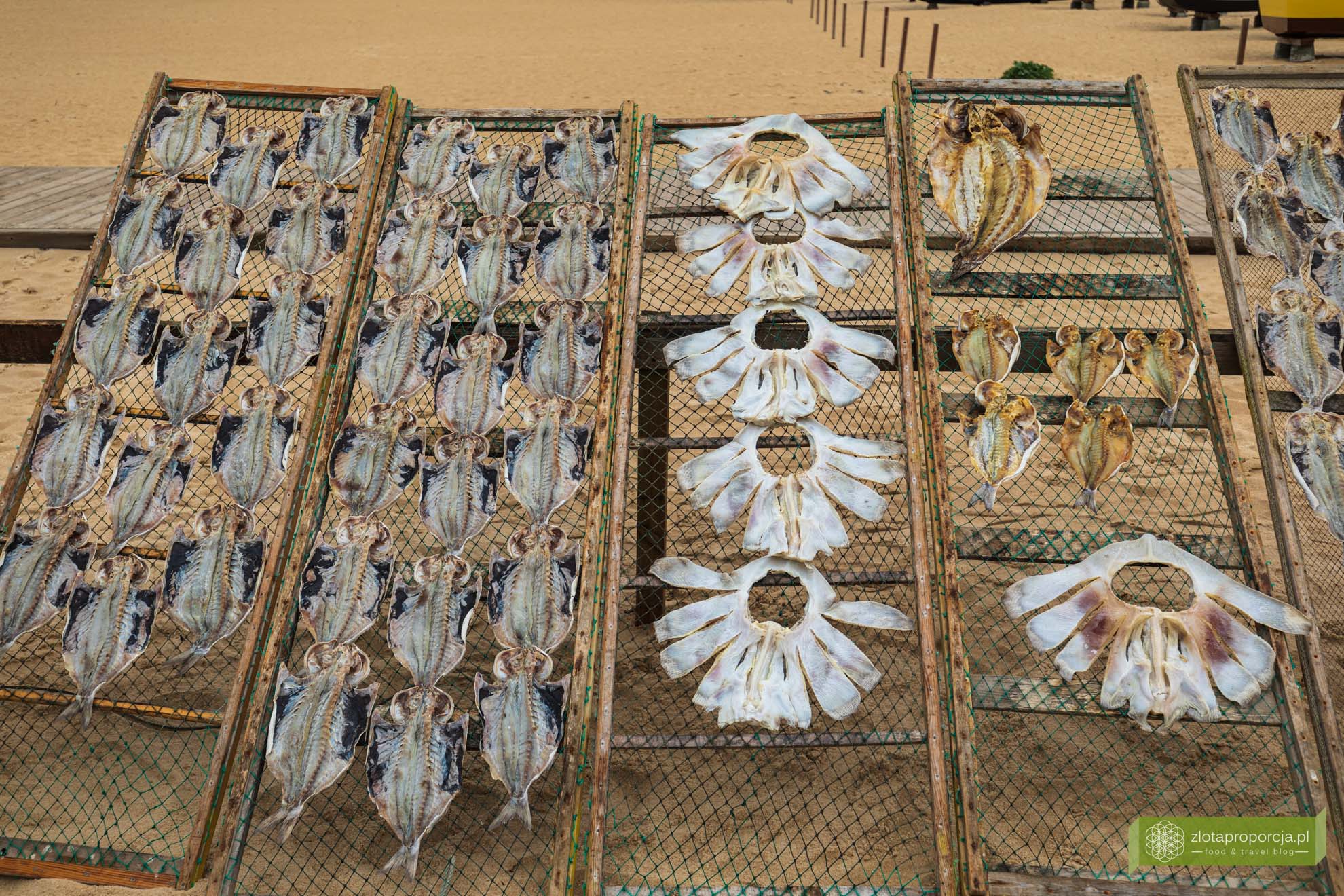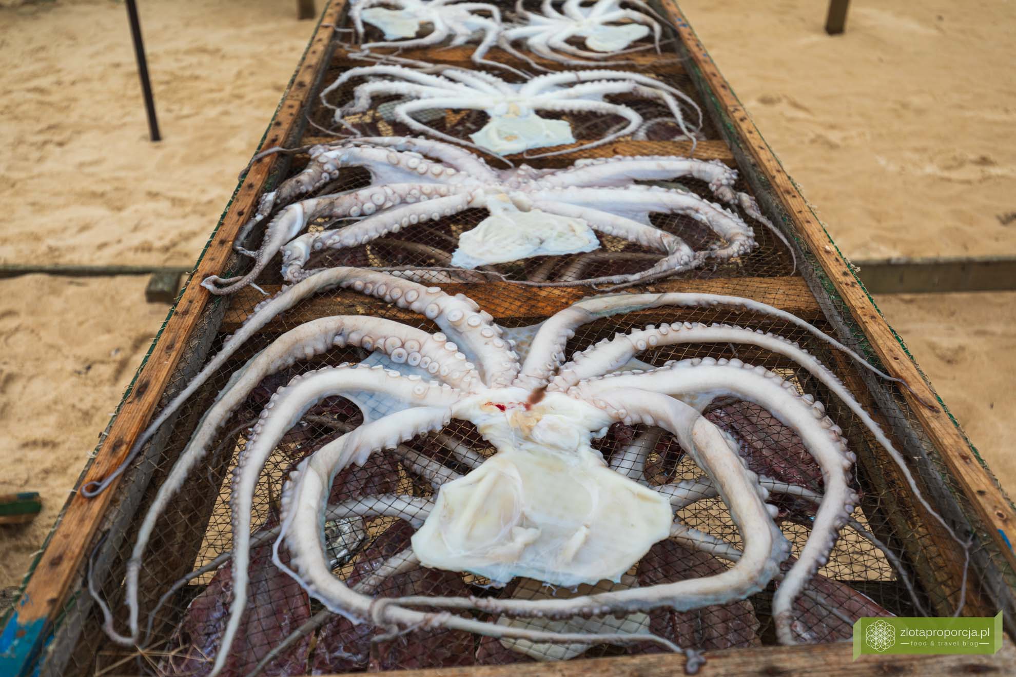 Na tym niezwykłym targu na plaży ryby i owoce morza są nie tylko suszone, ale także sprzedawane. Jeżeli więc lubicie suszone ryby, możecie zrobić tu fajne zakupy. Ponadto dziesiątki rozkrojonych ryb i ośmiornic wyglądają naprawdę ciekawie i robią wrażenie! Jeżeli zastanawiacie się nad zapachem w tej części plaży, to nie sprawiał on dyskomfortu. Wiatr wszystko rozwiewał, jedynie stojąc bezpośrednio przy suszących się rybach czuliśmy ich zapach, ale nie był on bardzo intensywny.