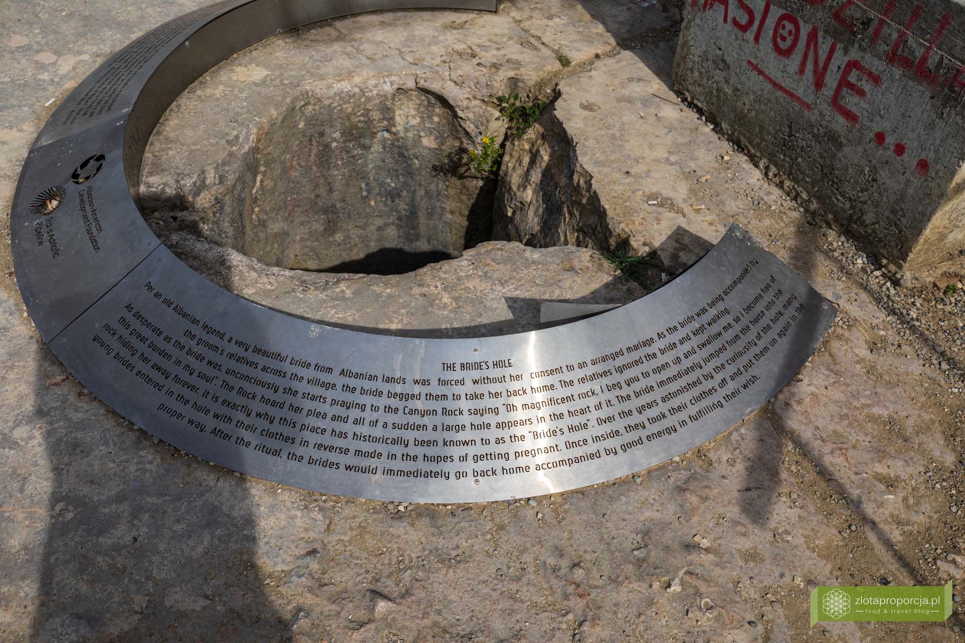 Naszym kolejnym przystankiem był punkt widokowy Vrima e Nuses związany z legendą o dziurze Panny Młodej (Bride’s Hole). W skrócie do skalnej dziury znajdującej się właśnie tutaj miała uciec przed aranżowanym małżeństwem legendarna zdesperowana Panna Młoda. Za sprawą legendy zaczęto uznawać, że dziura przynosi szczęście kobietom starającym zajść w ciążę. Wystarczy tylko wejść do dziury w ubraniu założonym na lewą stronę, a po wyjściu z niej założyć ubranie na właściwą stronę i szybko wrócić do domu. Ale zostawmy legendę i wróćmy do punktu widokowego.