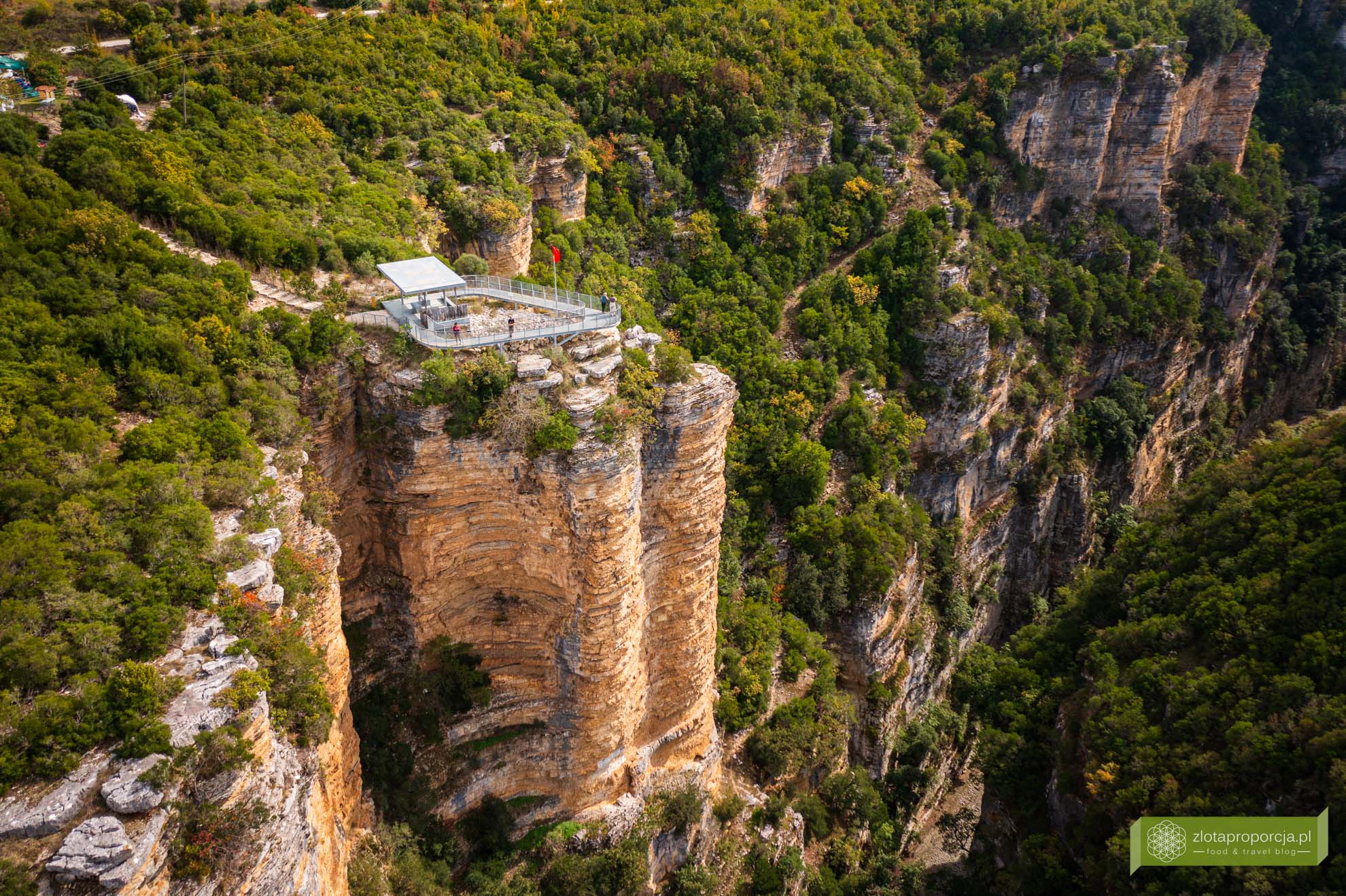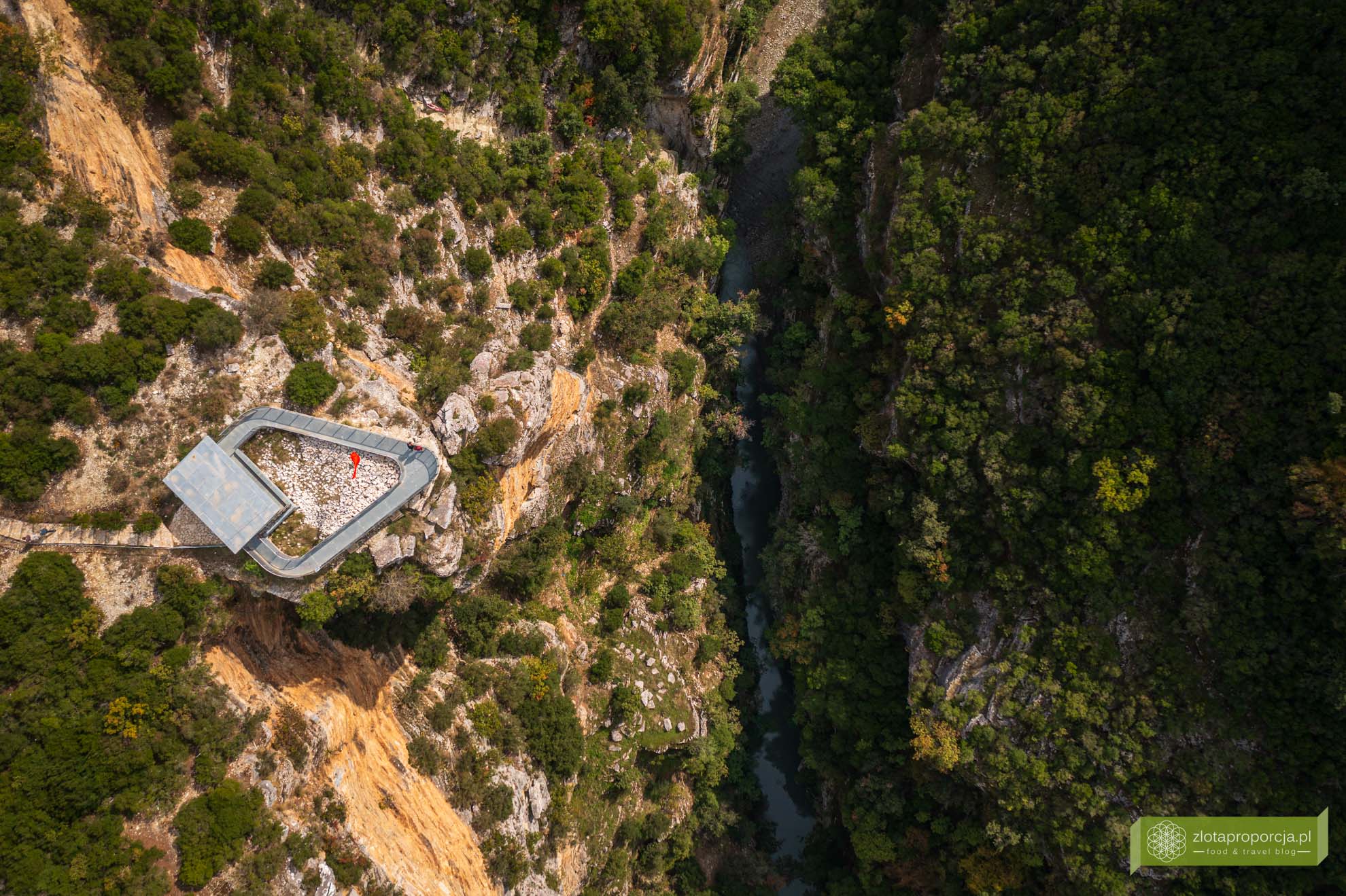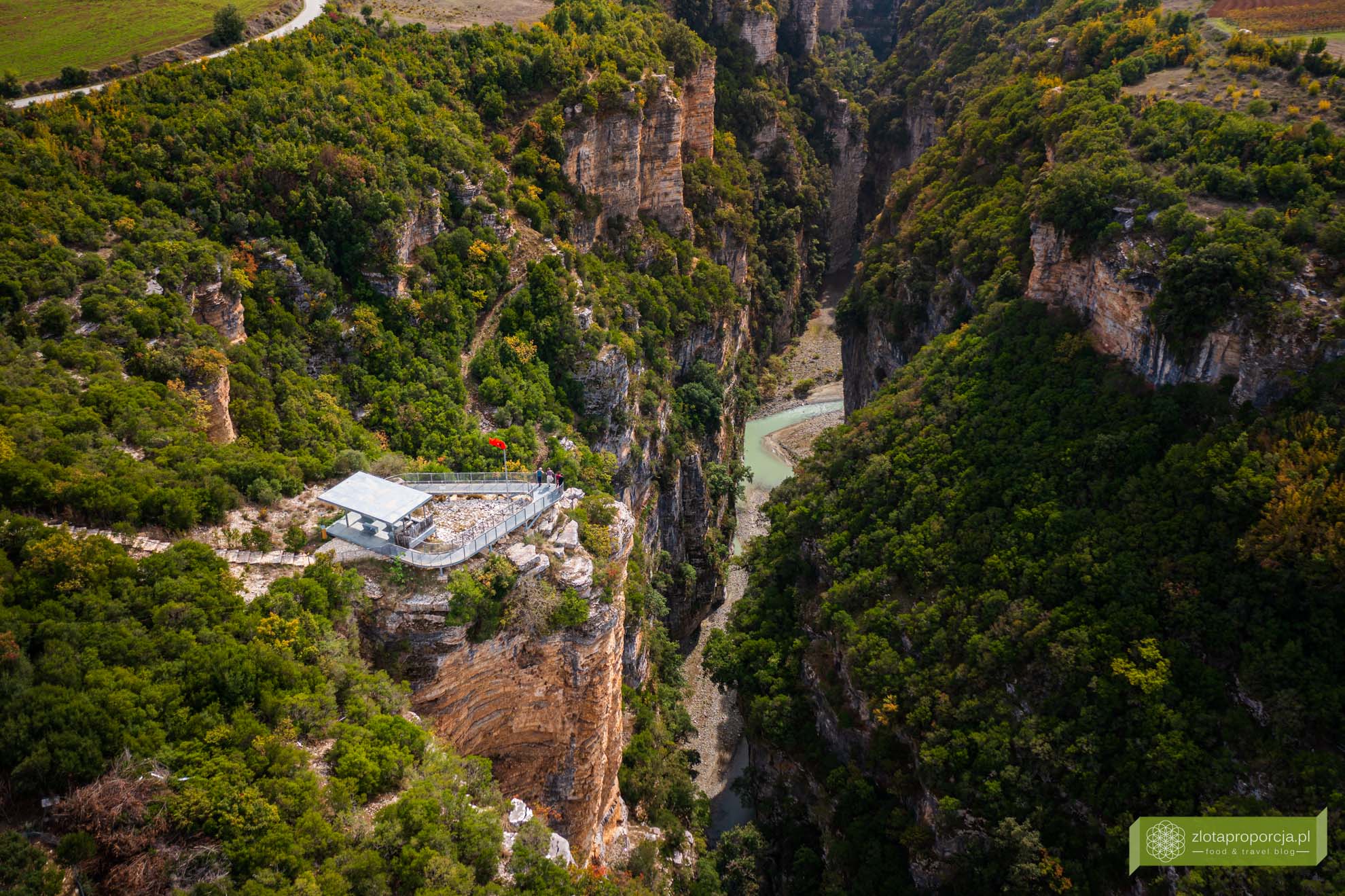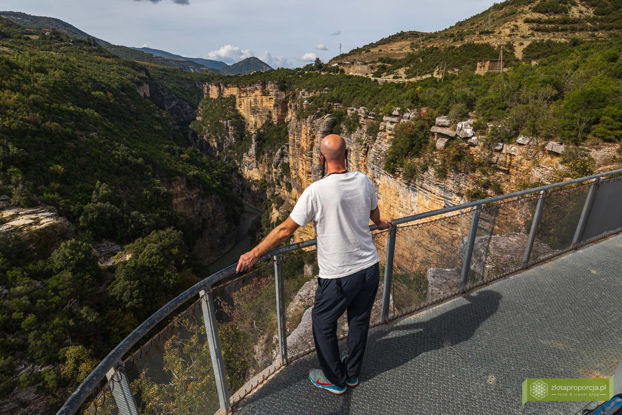 Pierwszym punktem, który odwiedziliśmy była platforma widokowa o ciekawej konstrukcji ze spektakularnymi widokami. Jest ona położona najbliżej Beratu. Zbudowano ją na krawędzi skalnej ściany z fantastycznymi widokami na kanion. Aby się do niej dostać musisz przejść przez niewielki kemping z małą kawiarenką. Na kempingu znajduje się też parking bez problemu dostępny dla odwiedzających platformę. Zarówno wejście na platformę, jak i parking były bezpłatne.